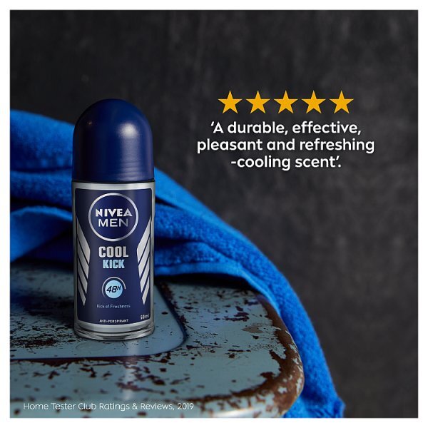 Nivea Men Cool Kick Anti-Perspirant Deodorant Roll On - A Cool Kick Of Freshness Nivea Men Cool Kick Anti-Perspirant Deodorant Gives You An Instant Feeling Of Freshness While Effectively Protecting You From Sweat And Body Odour For 48 Hours. The Formula With Cool-Care Will Leave You Feeling Fresh While Protecting And Caring For Your Skin No Matter What Your Day Has In Store And Provides Dry Freshness To Keep You Feeling Clean For The Rest Of The Day. The Men'S Deodorant Roll On Is Skin Tolerance Dermatologically Approved And Is Completely Alcohol-Free. Product Benefits: β’ Long-Lasting Freshness, With Ocean Extracts β’ 48H Effective Anti-Perspirant Protection β’ Skin Tolerance Dermatologically Approved β’ Roll-On Deodorant β’ 0% Ethyl Alcohol β’ Cool And Fresh Fragrance