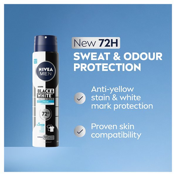 Nivea Men Invisible Fresh Deodorant Spray Provides White Mark Protection On Black Clothing & Anti-Yellow Staining On White Clothing. It Has Reliable 72H Protection And Is Tough On Sweat And Odour