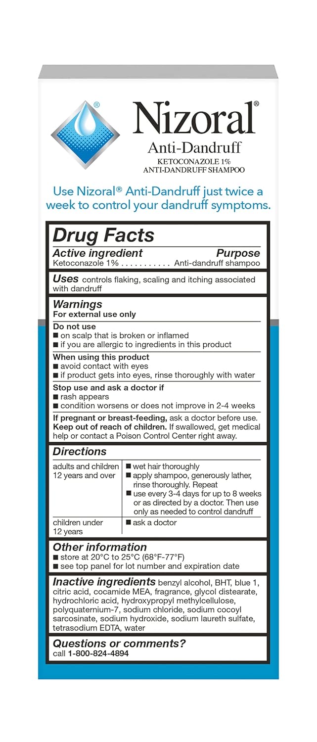 Fresh-smelling anti-dandruff shampoo controls flaking, scaling, and itching associated with dandruff. Made with ketoconazole 1%, use it just twice a week between regular shampoos for dandruff relief. Use as directed,CLINICALLY PROVEN: Clinically proven to control flaking, scaling and itching from dandruff. Nizoral is so powerful it can even control severe dandruff,CONTROLS SCALP FUNGUS: Nizoral is different because it doesn’t just address the symptoms, it gets right to the root of dandruff as it kills the fungus that causes it,KETOCONAZOLE 1%: The only over the counter dandruff shampoo with Ketoconazole 1%, a clinically proven, powerful dandruff fighting ingredient,10X MORE EFFECTIVE at fighting scalp fungus: The active ingredient in Nizoral is 10X more effective at killing scalp fungus, the primary cause of dandruff, than the active ingredient in the leading dandruff shampoo based on lab testing (not a product to product comparison)”,GENTLE ON HAIR: Gentle enough to use on color treated, chemically processed, or gray hair. Clean fresh scent and you only have to use it 2x per week