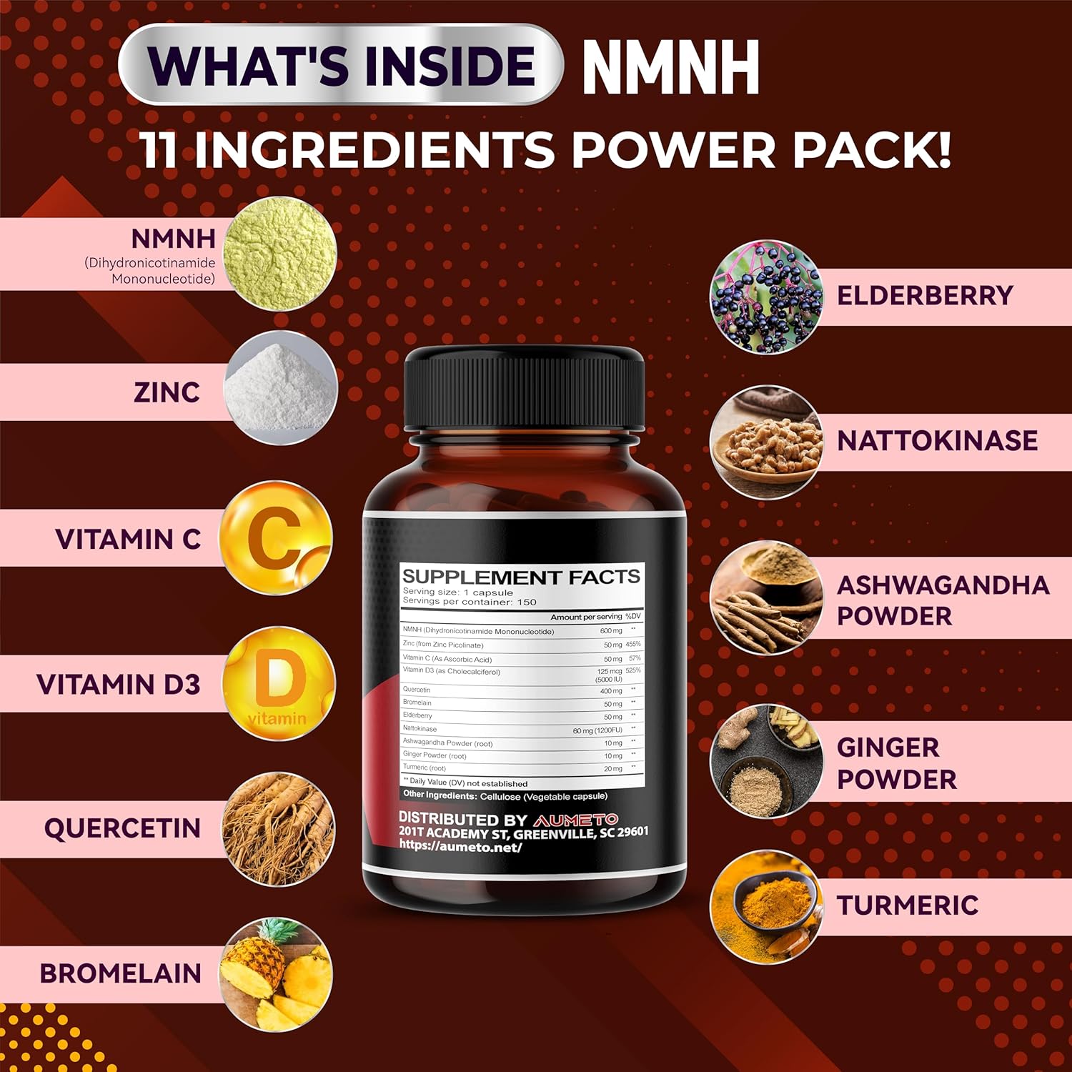 About this item Advanced NMNH Cellular Formula*: Powered by 600 mg of NMNH (Nicotinamide Mononucleotide Hydrogen), this high-potency blend supports your daily cellular health and energy production.* With Zinc, Quercetin & Elderberry*: Zinc and Quercetin are combined with Elderberry and Vitamin C for balanced daily wellness support, crafted to fit modern routines.* Healthy Aging & Vitality Blend* Features Nattokinase, Turmeric, Bromelain, and Vitamin D3 to support your long-term wellness, mobility, and overall vitality.* See more product details,Advanced NMNH Cellular Formula*: Powered by 600 mg of NMNH (Nicotinamide Mononucleotide Hydrogen), this high-potency blend supports your daily cellular health and energy production,With Zinc, Quercetin & Elderberry*: Zinc and Quercetin are combined with Elderberry and Vitamin C for balanced daily wellness support, crafted to fit modern routines,Healthy Aging & Vitality Blend* Features Nattokinase, Turmeric, Bromelain, and Vitamin D3 to support your long-term wellness, mobility, and overall vitality
