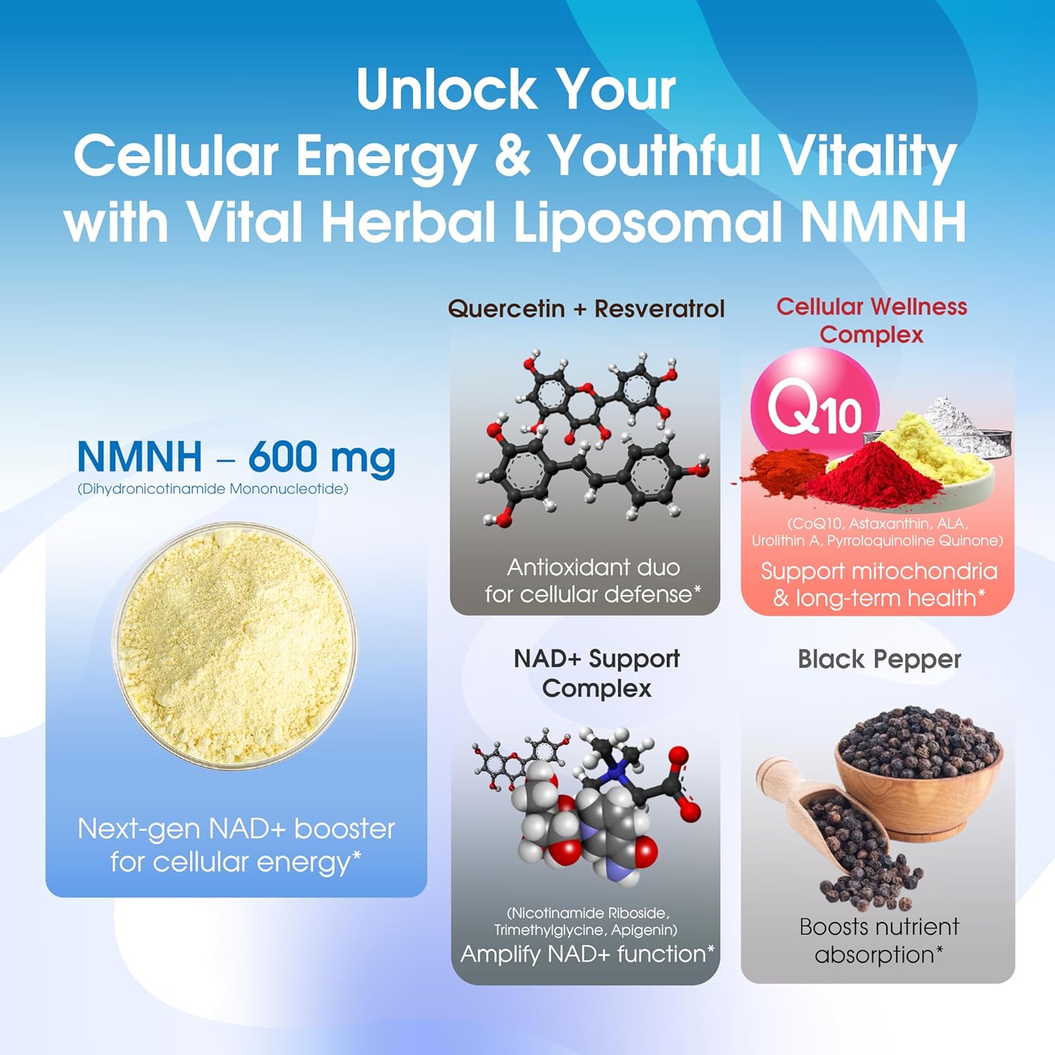 12-in-1 LIPOSOMAL BLEND: Formulated with NMNH, Quercetin, Trans-Resveratrol, and more, this advanced blend helps supports healthy NAD+ function, cellular energy, and promote healthy aging. Crafted in the USA with trusted quality