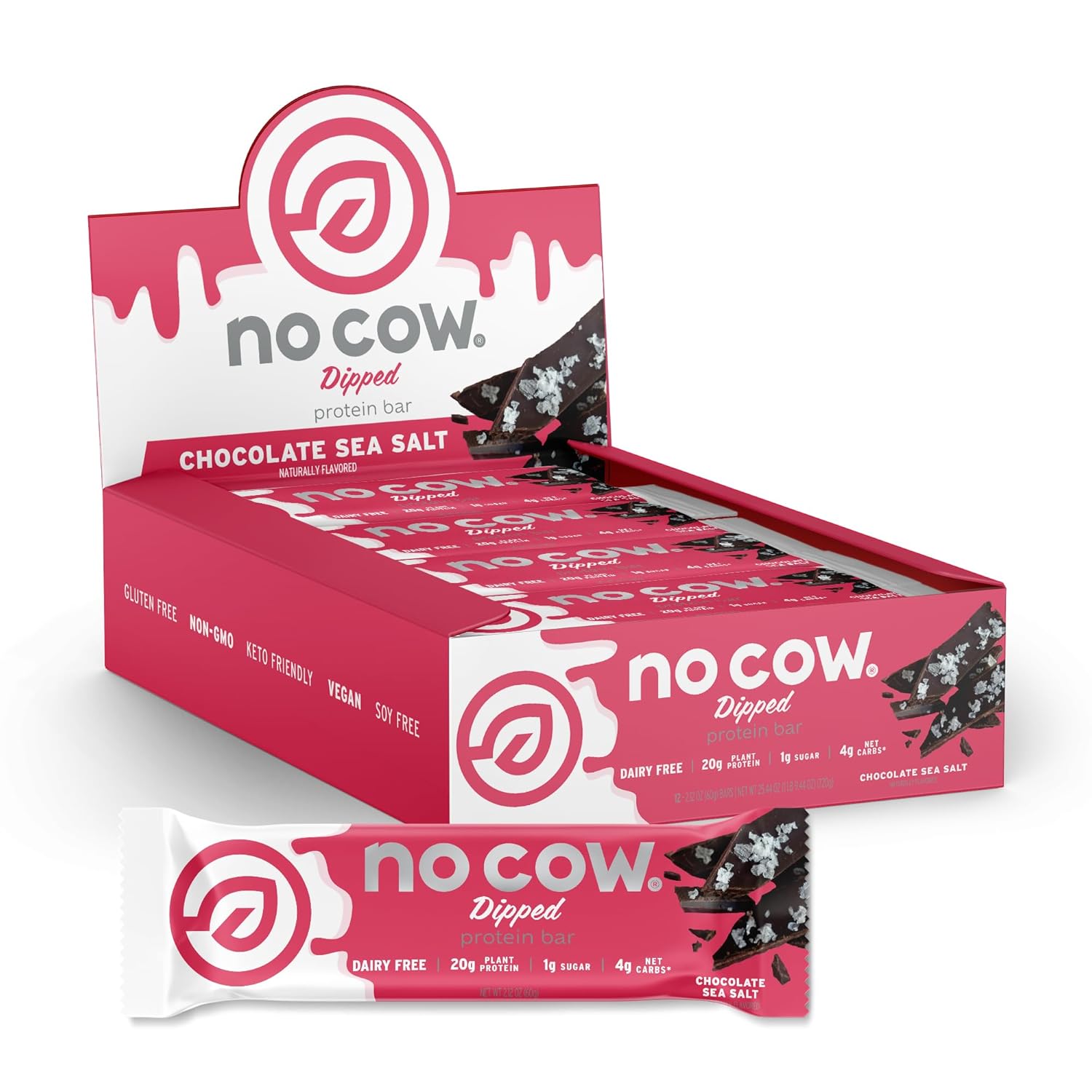No Cow High Protein Bars, Chocolate Sea Salt - Healthy Snacks, 20G Vegan Protein, High Fiber, Low Sugar, Keto Friendly, Dairy & Gluten Free (12 Count)