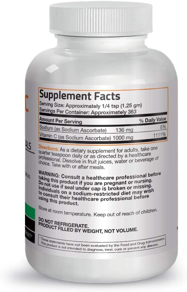A Non-Acidic Vitamin C That Is Gentle On The Stomach. Powerful Immune Support!* Vitamin C Is A Water-Soluble Vitamin Found In Such Foods As Citrus Fruits, Green And Leafy Vegetables, Tomatoes And Cauliflower. In Addition To The Formation Of Collagen, Vitamin C Is A Key Protector Of The Body From The Ravages Of Potentially Harmful Free Radicals, As Well As An Effective Aid In Maintaining A Healthy Immune System. The Body Cannot Make Or Store Vitamin C, So It Must Be Replaced Every Day Because Much Of It Is Washed Out Of The Body Daily Through The Kidneys. To Make Sure You'Re Receiving Enough Of The Right Type Of Vitamin C, Bronson Has Many Special Formulas. One Of Bronson'S Best-Selling Vitamin C Products! In A Soluble Fine Crystal Format, It Comes With A Scoop For Handy Measuring. One Furnished Scoopful, Supplies Approximately 1,000 Mg. Of Vitamin C As Sodium Ascorbic For A Non-Acidic Vitamin C That Is Gentle On The Stomach. You Can Add It To Fruit Juice Or Water And It Has A Naturally Tart Taste. * These Statements Have Not Been Evaluated By The Food And Drug Administration. This Product Is Not Intended To Diagnose, Treat, Cure Or Prevent Any Disease