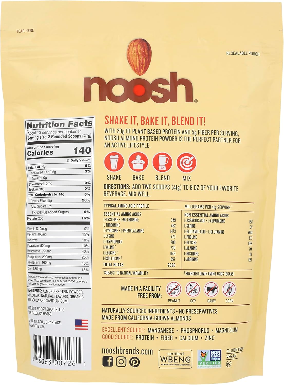 About this item WITH NOOSH VANILLA PROTEIN POWDER, you get high quality protein created from California almonds OUR UNIQUE PROCESS maximizes the nutritional value of every almond and gives you the protein you need without all the unwanted fillers found in most products today 100% ALMOND PLANT PROTEIN POWDER with 20 grams of protein per serving PEANUT FREE, SOY FREE, AND DAIRY FREE CERTIFIED TO THE HIGHEST STANDARDS - Vegan, Gluten Free, Kosher, NON GMO, and Women owned company NO PRESERVATIVES OR ARTIFICIAL FLAVORS EASY TO MIX AND TASTES DELICIOUS! › See more product details,WITH NOOSH VANILLA PROTEIN POWDER, you get high quality protein created from California almonds,OUR UNIQUE PROCESS maximizes the nutritional value of every almond and gives you the protein you need without all the unwanted fillers found in most products today,100% ALMOND PLANT PROTEIN POWDER with 20 grams of protein per serving,PEANUT FREE, SOY FREE, AND DAIRY FREE,CERTIFIED TO THE HIGHEST STANDARDS - Vegan, Gluten Free, Kosher, NON GMO, and Women owned company,NO PRESERVATIVES OR ARTIFICIAL FLAVORS,EASY TO MIX AND TASTES DELICIOUS!