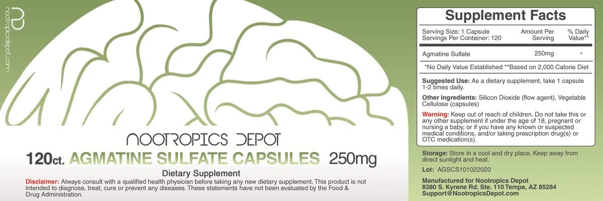 DESCRIPTION : Nootropics Depot Agmatine Sulfate Capsules | 250mg | 120 Count | Energy Supplement | Amino Acid Derivative | Supports Physical Strength and Workout Recovery | Nitric Oxide Booster120 Count (Pack of 1)