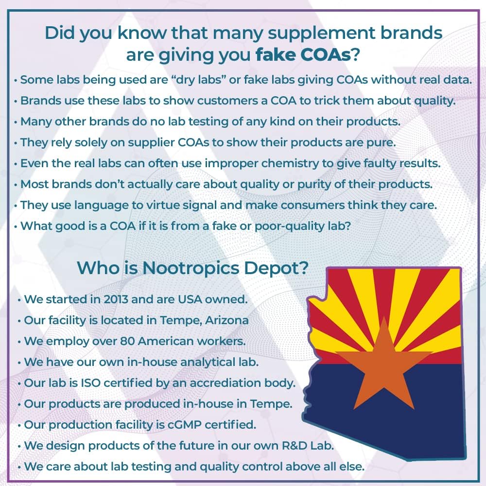 BULLET POINTS : 1 > LAB TESTED AND VERIFIED - All Nootropics Depot products are thoroughly lab tested to ensure our customers are receiving only the highest quality ingredients at the optimal strength, potency and purity. We take pride in the amount of research put into every product by sourcing only the highest quality and innovative ingredients