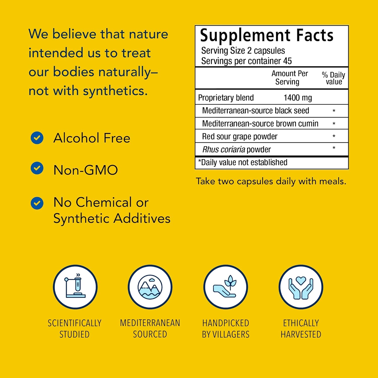 Full Ingredient List; Mediterranean-source black seed, Mediterranean-source brown cumin, red sour grape powder, Rhus coriaria powder; Free of all chemicals, pesticides & additives; Non-GMO