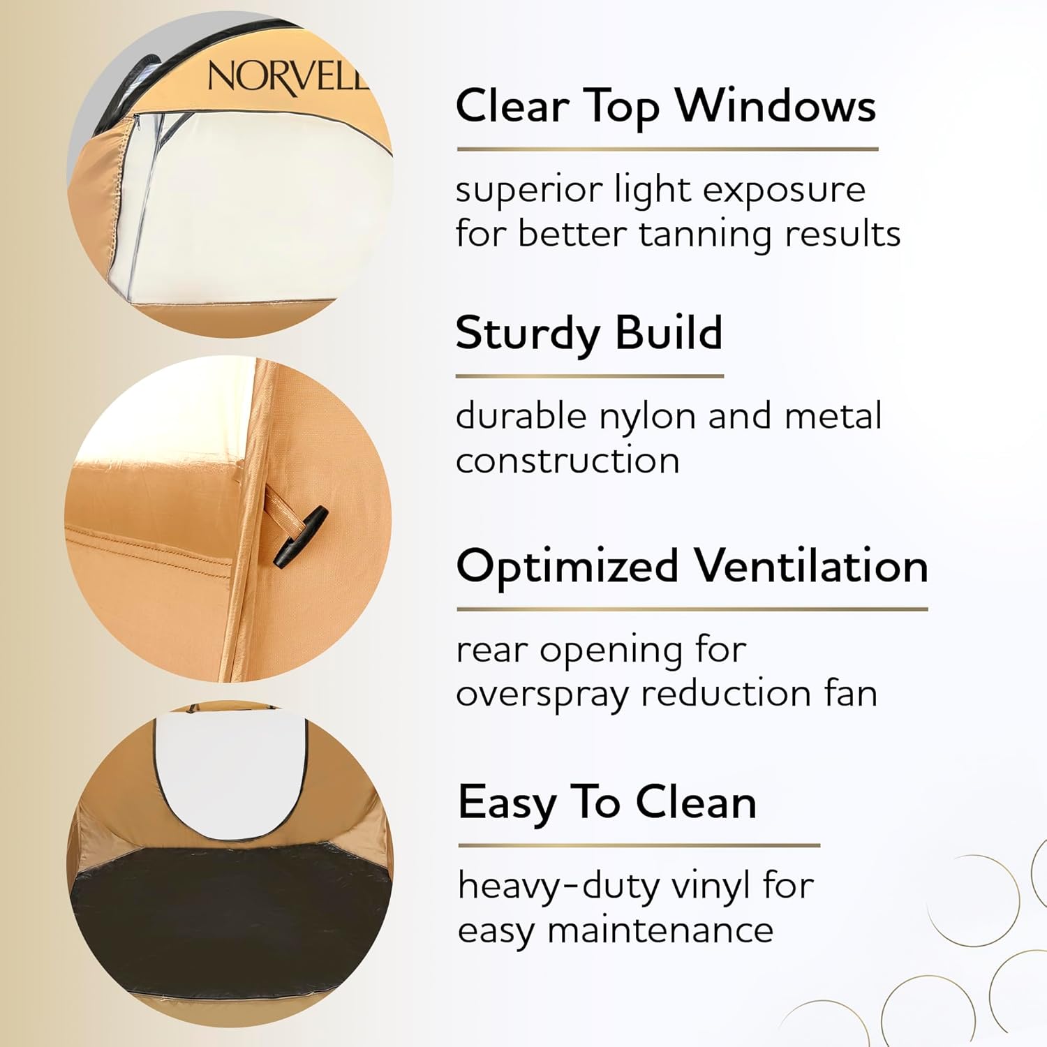Bring your new spray tan business to life with this Norvell Spray Tan Room Bundle. Easy to transport and setup a pop-up spray tan booth anywhere. Made of sturdy metal tent poles, the spacious tent has clear windows at the top for maximum light exposure and heavy-duty vinyl at the bottom to protect from overspray. The largest mobile spray tan room in the market, this tent is perfect for use as a spray room or a dressing room at a multiple client event. The overspray reduction fan drastically reduces unwanted overspray when giving a spray tan. The portable fan includes one filter and has three levels of strength for your needs. Its 5ft long cord has a 2-pronged power plug. This bundle is lightweight, compact, and easy to clean. The tanning tent has a carrying case for easy transport. The tent weighs 8lbs and measures 86” x 48” x 52”. The fan weighs 12lbs and measures 22.5” x 5.5” x 21.5”. With over 40 years of experience, Norvell’s products are designed to deliver a natural glow. Our famous Norvell University has offered award winning training to over 20,000 certified technicians worldwide, making Norvell the #1 Professional’s Choice for sunless tanning,Vinyl,TENT & FAN BUNDLE – Unleash confidence and glow with your clients with the Norvell Tent and Fan Bundle. This professional package makes it easy for Spray Tan Artists to transport and setup a spray tanning tent, for use with a spray tan machine system,SPRAY ROOM TENT – Made of sturdy metal tent poles, the tanning tent has clear windows at the top for light exposure & heavy-duty vinyl at the bottom to protect from overspray. Easy to assemble & take down, the large tent works perfectly as a spray room,OVERSPRAY REDUCTION FAN – Drastically reduce unwanted overspray when giving spray tans. The overspray fan has three levels of strength for your desired needs and airflow preferences. The 5ft long cord has a 2-pronged power plug that can be used anywhere,PORTABLE & COMPACT – This professional spray tan bundle is lightweight and compact, allowing you to bring your tanning booth wherever you go. The tent weighs 8lbs and measures 86” x 48” x 52”. The fan weighs 12lbs and measures 22.5” x 5.5” x 21.5”.PORTABLE & COMPACT – This professional spray tan bundle is lightweight and compact, allowing you to bring your tanning booth wherever you go. The tent weighs 8lbs and measures 86” x 48” x 52”. The fan weighs 12lbs and measures 22.5” x 5.5” x 21.5”,NORVELL – With 40 years’ experience, Norvell products are designed to deliver a natural glow. Our famous Norvell University offers award winning training to certified technicians worldwide, making Norvell the #1 Professional’s Choice for sunless tanning