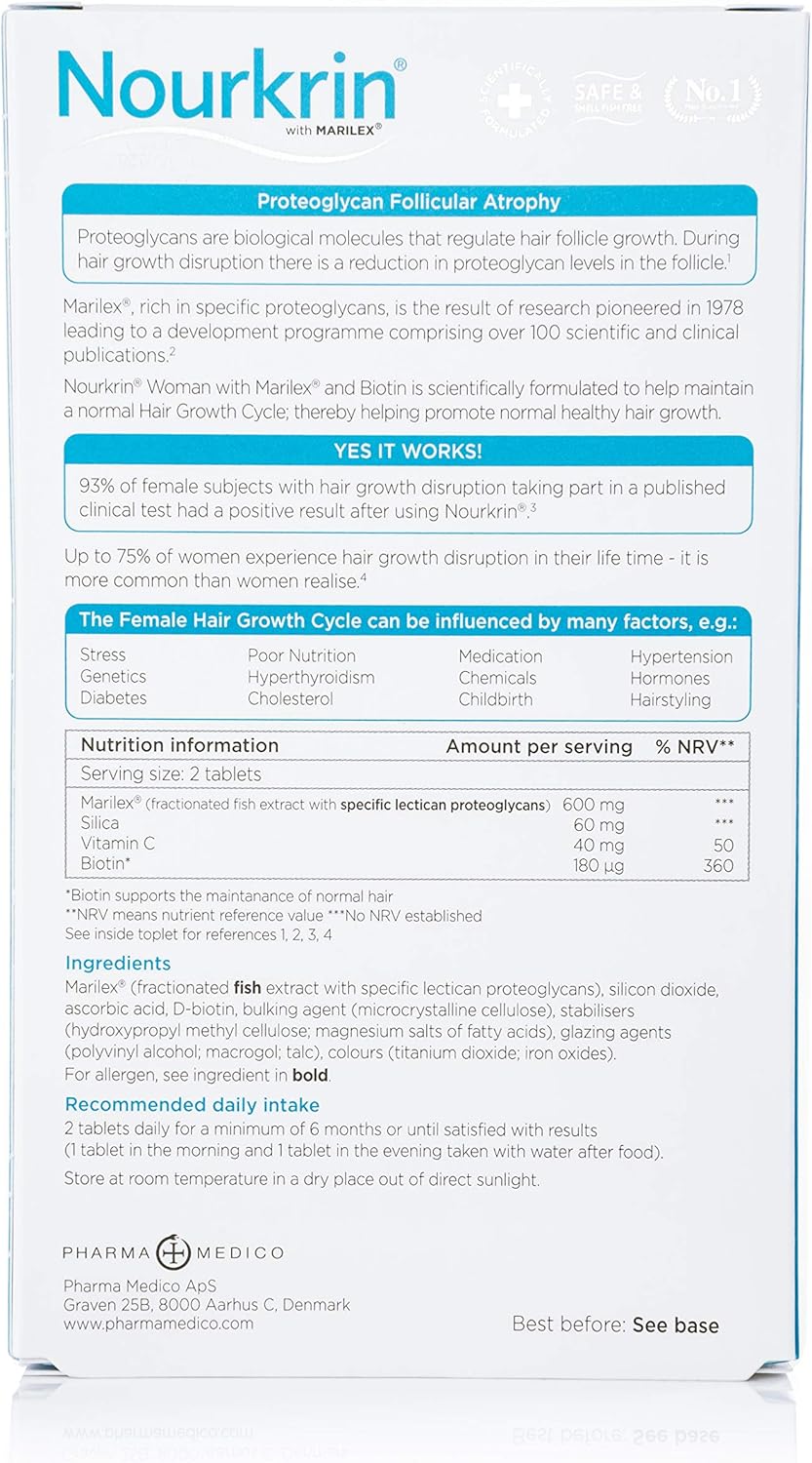 Product Description Nourkrin WOMAN with the unique Marilex is scientifically formulated to help maintain a normal Hair Growth Cycle, which helps to support normal healthy hair growth Ingredients MARILEX (FRACTIONATED FISH EXTRACT WITH SPECIFIC LECTICAN PROTEOGLYCANS), SILICON DIOXIDE, D-BIOTIN, BULKING AGENTS (MICROCRYSTALLINE CELLULOSE; DICALCIUM PHOSPHATE), STABILISERS (HYDROXYPROPYL METHYL CELLULOSE; MAGNESIUM SALTS OF FATTY ACIDS), GLAZING AGENTS (FATTY ACIDS; GLYCEROL). Shampoo: Aqua, Sodium Coco-Sulfate, Cocamidopropyl Betaine, Sodium Chloride, Butylene Glycol,Benzoic Acid. Conditioner: Aqua, Potassium Sorbate, Cetearyl Alcohol, Mentha Piperita Oil, Oleanolic Acid. P.when('A').execute(function(A) { A.on('a:expander:toggle_description:toggle:collapse', function(data) { window.scroll(0, data.expander.$expander[0].offsetTop-100); }); }); Directions take the tablets as directed Safety Warning For external use only. Avoid contact with eyes, mouth, and other mucous membranes. Discontinue use if you experience allergic reactions such as scalp irritation, redness, or rash. Not recommended for use by pregnant or nursing women. Keep out of reach of children. Not for use by individuals under 18 years old. Do not use on damaged, sunburned, or irritated scalp. Consult a healthcare professional if you're using other medications, especially those applied to the scalp. Some ingredients may affect blood pressure. Consult a doctor if you have heart disease. Avoid using on other body parts to prevent unwanted hair growth. May increase sensitivity to sunlight. Follow instructions carefully regarding dosage and frequency of application. Stopping treatment may lead to reversal of hair regrowth. Keep away from fire or flame. Do not use after the expiration date. Consult a healthcare provider before use if you have any underlying medical conditions. See more,Six months supply (360 Tablets) plus FREE 2 x Shampoo and 2 x Conditioner,FREE Liquid Products worth GBP51.80,Clinically proven to help maintain a healthy Hair Growth Cycle,Only Hair Growth product to be awarded GOLD MEDAL by hair loss experts at The World Trichology Society,Natural, drug-free and easy to swallow