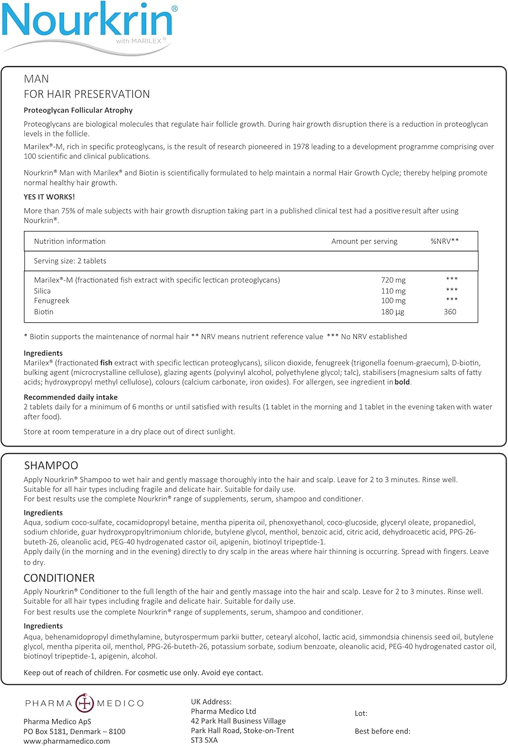 Product Description Daily Supplement for men. There are many factors that can affect men’s hair growth, including transient factors such as stress and illness. Nourkrin is a natural food supplement that is formulated to supply the body with the nutrients required to preserve hair growth, thickness and density, e.g. biotin, plus Marilex-M. Nourkrin Man is scientifically formulated to help preserve a normal Hair Growth Cycle, helping preserve normal hair growth and thickness, and contains the exclusive ingredient Marilex-M, a fractionated FISH extract, which is unique to Nourkrin and developed to help address the factors specifically affecting male hair health. To achieve optimum results, take 2 tablets per day as per pack instructions for a minimum of 6 months. Ingredients Nourkrin Man Value Pack 180 Tablets, Shampoo and Conditioner P.when('A').execute(function(A) { A.on('a:expander:toggle_description:toggle:collapse', function(data) { window.scroll(0, data.expander.$expander[0].offsetTop-100); }); }); Directions 2 tablets daily for a minimum of 6 months or until satisfied with results (1 tablet in the morning and 1 tablet in the evening taken with water after food). Safety Warning Tablets: not suitable for those allergic to fish. Keep out of reach of children. Food supplements are not intended as a substitute for a varied diet. Do not exceed recommended daily dose. Consult your doctor if on medication. Shampoo & conditioner: Keep out of reach of children. For cosmetic use only. Avoid contact with eyes. Box Contains 1 x Nourkrin Man 1 x Nourkrin Shampoo 1 x Nourkrin Conditioner See more,3 month supply Value Set containing FREE Shampoo and Conditioner,Nourkrin MAN is an all-natural, drug-free Hair Prevention Programme for Men,The treatment is designed to reduce and prevent hair loss by supporting the existing, normal hair growth,To be used over a 6 month period,180 tablet box