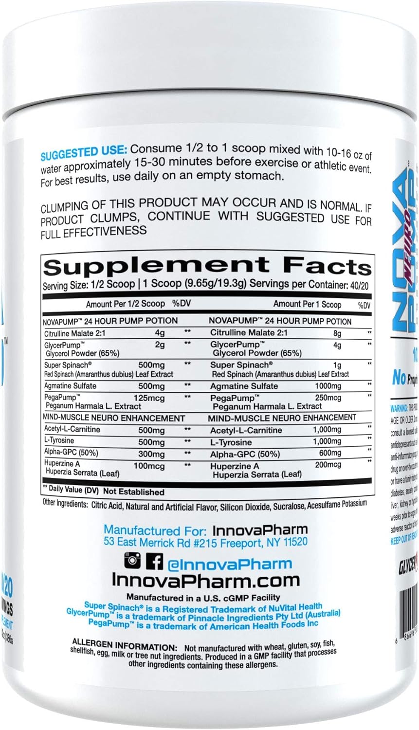 Loaded with focus enhancing nootropics and heavy doses of clinically proven nitric oxide enhancing ingredients, NOVAPUMP NEURO provides INTENSE FOCUS, ALL DAY ENERGY and MASSIVE MUSCLE PUMPS, all without the use of Caffeine or other stimulants!