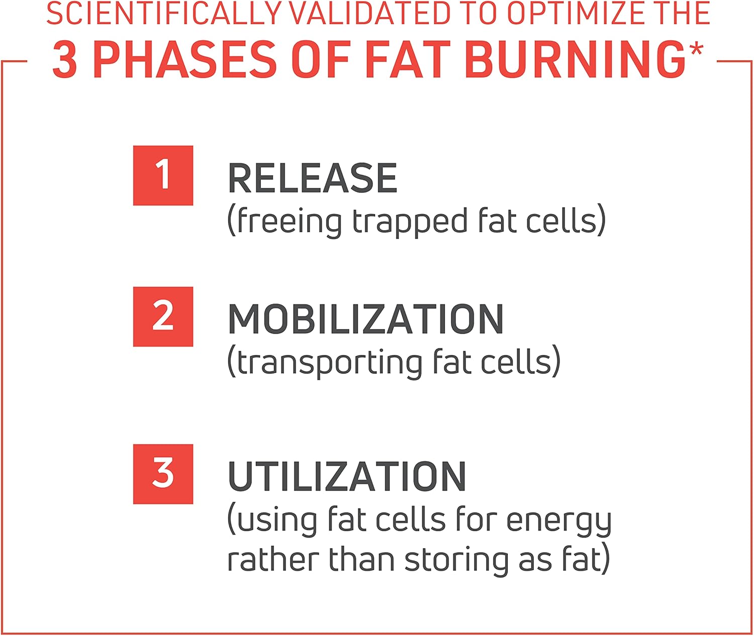 THREE-PRONGED APPROACH: This cutting-edge formula optimizes the three phases of fat burning–lipid release, transport, and utilization–to help release trapped fat cells, mobilizing them so they can be used for energy, rather than stored as fat