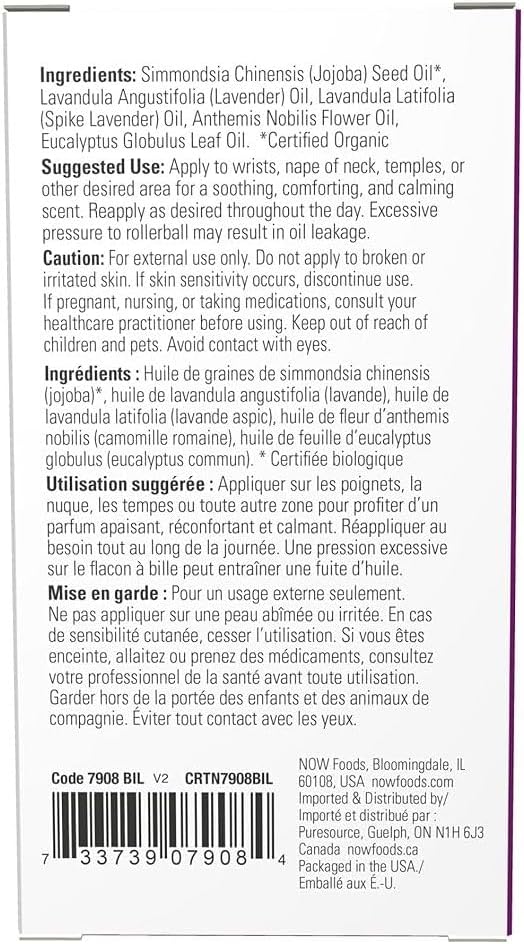 Ingredients: Simmondsia Chinensis (Jojoba) Seed Oil*, Lavandula Angustifolia (Lavender) Oil, Lavandula Latifolia (Spike Lavender) Oil, Anthemis Nobilis Flower Oil, Eucalyptus Globulus Leaf Oil. *Certified Organic Aroma: Herbal, Floral, Camphorous Attributes: Soothing & Calming No Synthetic Fragrances Or Chemicals Now® Essential Oil Products Are Not Tested On Animals. Now® Essential Oils Are Analytically Tested For Identity, Purity, And Adulteration To Assure The Highest Quality. Packaged In The Usa. Vegan