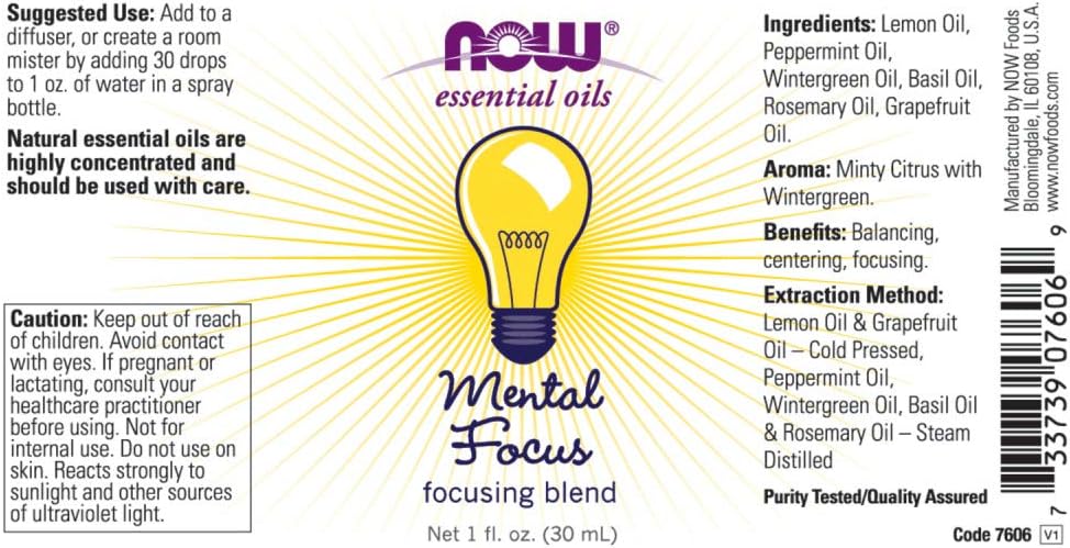 Now Essential Oils, Mental Focus Oil Blend, Centering Aromatherapy Scent, Blend Of Pure Essential Oils, Vegan, Child Resistant Cap, 1-Ounce