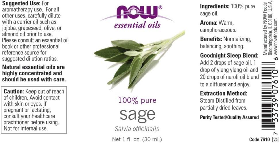 Now Essential Oils, Sage Oil, Normalizing Aromatherapy Scent, Steam Distilled, 100% Pure, Vegan, Child Resistant Cap, 1-Ounce