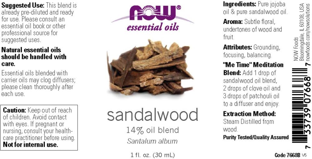 Now Essential Oils, Sandalwood Oil, 14% Blend Of Pure Sandalwood Oil In Pure Jojoba Oil, Grounding Essential Aromatherapy, Child Resistant Cap, 1-Ounce