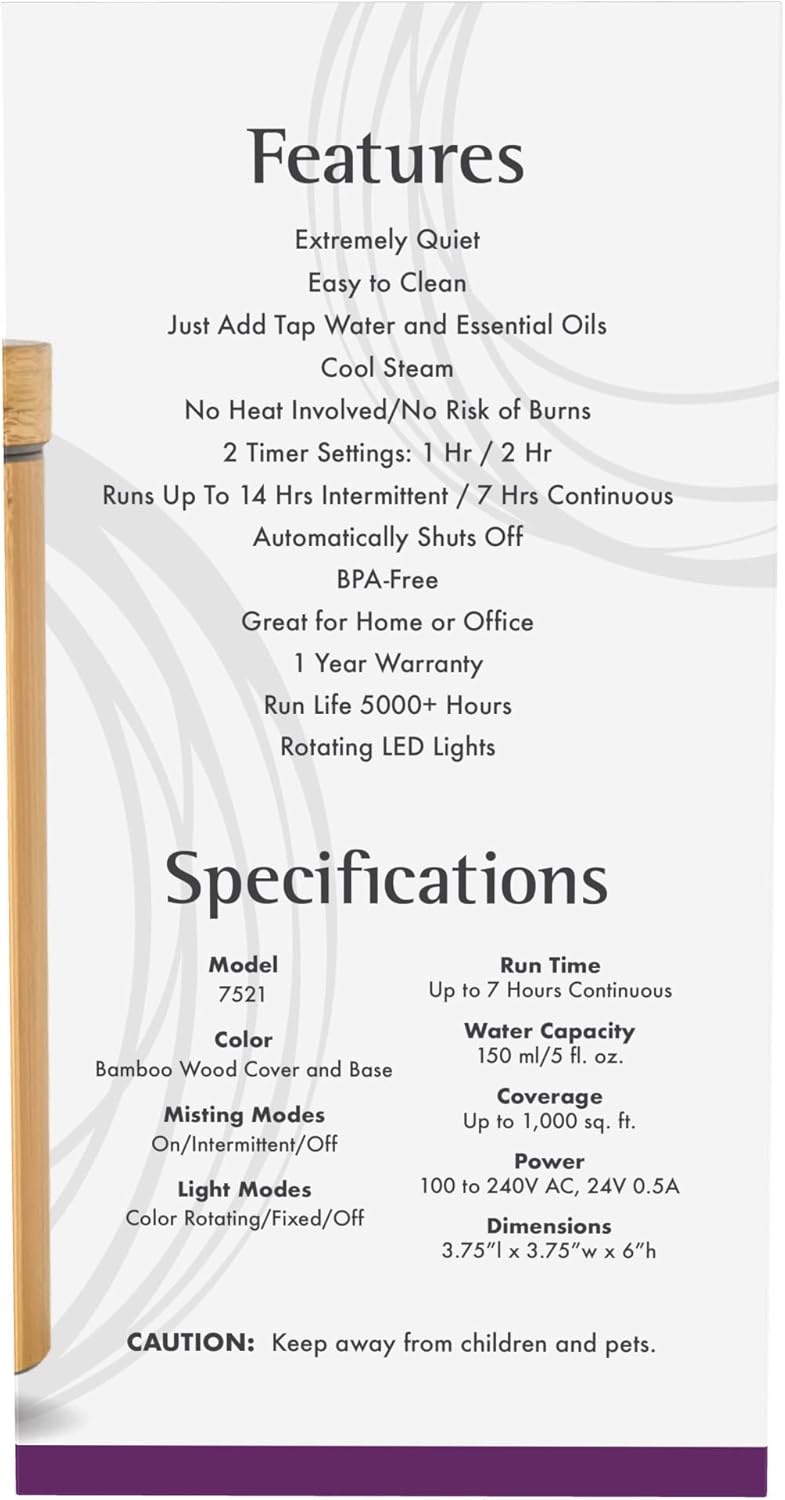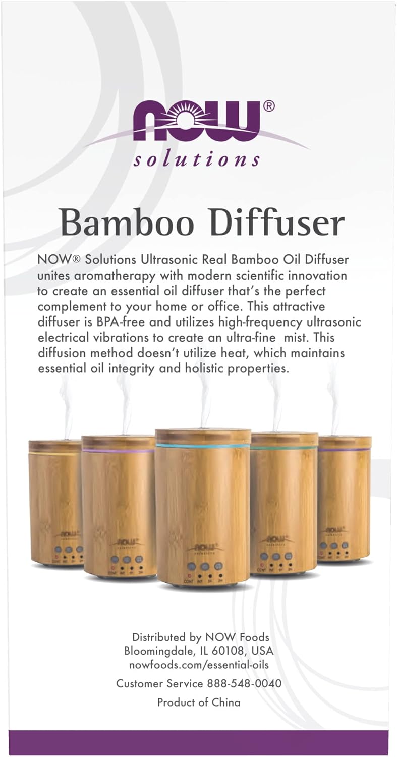 Just Add Tap Water And Essential Oils Extremely Quiet And Easy To Clean Cool Steam / No Heat Involved / No Risk Of Burns Automatically Shuts Off 2 Timer Settings (1 Hr / 2 Hr) Runs Up To 14 Hrs Intermittent / 7 Hrs Continuous Rotating Led Lights 1 Year Warranty Now® Solutions Real Bamboo Ultrasonic Oil Diffuser Unites Aromatherapy With Modern Scientific Innovation To Create An Essential Oil Diffuser That'S The Perfect Complement To Your Home Or Office. This Attractive Diffuser Is Bpa-Free And Utilizes High-Frequency Ultrasonic Electrical Vibrations To Create An Ultra-Fine Mist. This Diffusion Method Doesn'T Utilize Heat, Which Maintains Essential Oil Integrity And Holistic Properties. Specifications: Model: 7521 Color: Bamboo Wood Cover And Base Capacity: 150 Ml / 5 Fl Oz Run Time: Up To 14 Hrs Intermittent / 7 Hrs Continuous Features: Timer Setting 1 Hr / 2 Hr, Int/Cont. 3 Changing Led Lights: Blue, Green & Red Coverage: 400 Square Feet Rated Power: 12W Adapter Power: 100-240V, 24V 0.5A Wood/Bamboobamboo Has Long Been A Staple For Now® – A Sustainable Plant That Can Grow To Full Size In Just 3-4 Months, Compared To Trees That Can Take 30+ Years To Grow. We Use Bamboo Due To Its Naturally Renewing Properties, Coupled With Its Pesticide-Free And Chemical-Free Harvesting. Now Ultrasonic Essential Oil Diffuser Instruction Manual Now Diffuser Limited Warranty