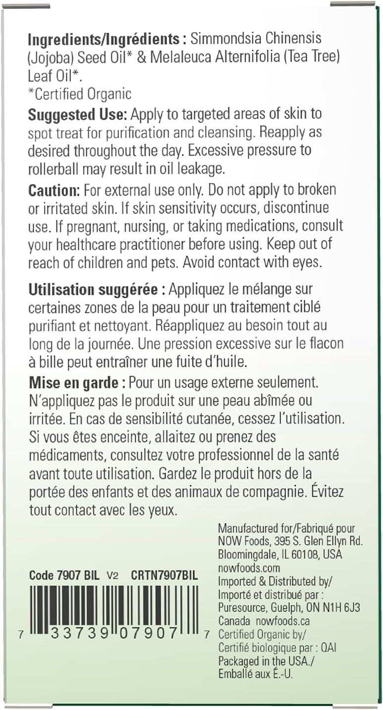 Ingredients: Simmondsia Chinensis (Jojoba) Seed Oil* & Melaleuca Alternifolia (Tea Tree) Leaf Oil*. *Certified Organic Aroma: Potent, Warm, Spicy Attributes: Purifying, Cleansing, Renewing Now® Essential Oils Are Analytically Tested For Identity, Purity, And Adulteration To Assure The Highest Quality. No Synthetic Fragrances Or Chemicals Now® Essential Oil Products Are Not Tested On Animals. Essential Oils Should Be Used With Care. Vegan Certified Organic By Qai. Packaged In The Usa