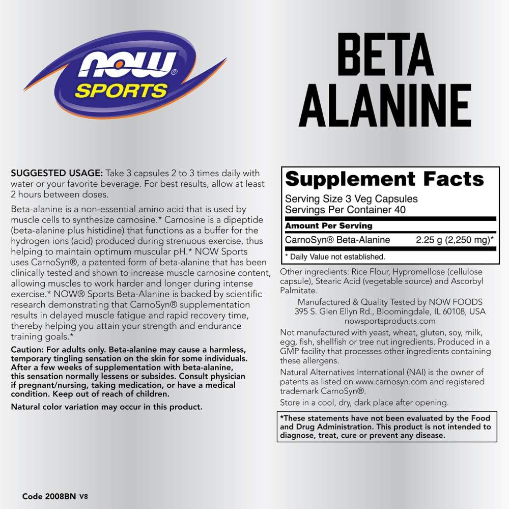 Now® Sports Beta-Alanine Is Backed By Scientific Research Demonstrating That Carnosyn® Supplementation Results In Delayed Muscle Fatigue And Rapid Recovery Time, Thereby Helping You Attain Your Strength And Endurance Training Goals.* Beta-Alanine Is A Non-Essential Amino Acid That Is Used By Muscle Cells To Synthesize Carnosine.* Carnosine Is A Dipeptide (Beta-Alanine Plus Histidine) That Functions As A Buffer For The Hydrogen Ions (Acid) Produced During Strenuous Exercise, Thus Helping To Maintain Optimum Muscular Ph.* Now® Sports Uses Carnosyn®, A Patented Form Of Beta-Alanine That Has Been Clinically Tested And Shown To Increase Muscle Carnosine Content, Allowing Muscles To Work Harder And Longer During Intense Exercise.* Natural Alternatives International (Nai) Is The Owner Of Patents As Listed And Registered Trademark Carnosyn®. Natural Color Variation May Occur In This Product