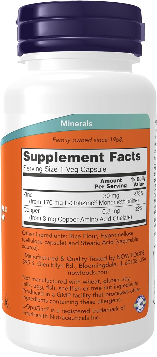 Now Foods Supplements, L-Optizinc® 30 Mg With Copper, Highly Bioavailable Form, Immune Support*, 100 Veg Capsules