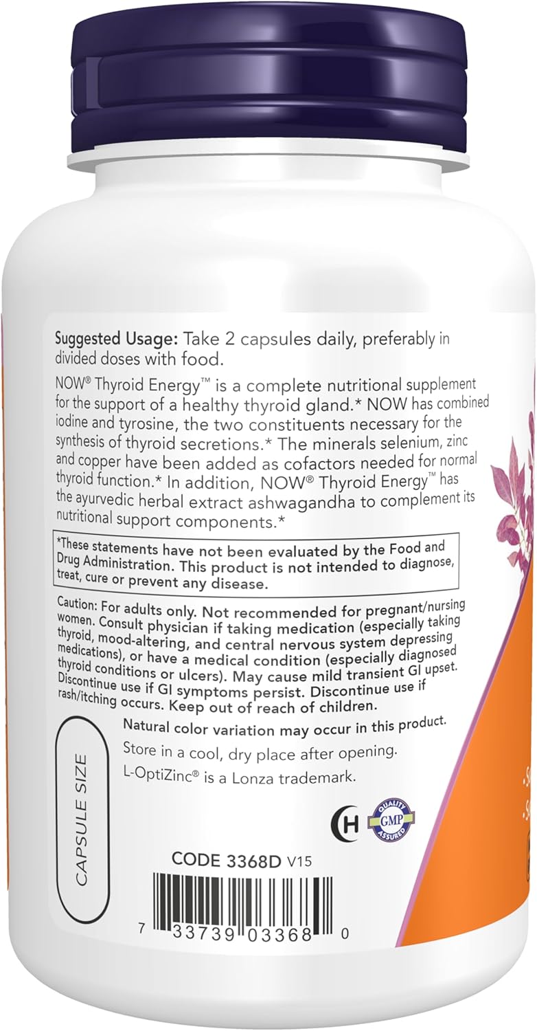 Product Description Supports Healthy Thyroid Function* Supports Healthy Metabolism* Now® Thyroid Energy Is A Complete Nutritional Supplement For The Support Of A Healthy Thyroid Gland.* Now Has Combined Iodine And Tyrosine, The Two Constituents Necessary For The Synthesis Of Thyroid Secretions.* The Minerals Selenium, Zinc And Copper Have Been Added As Cofactors Needed For Normal Thyroid Function.* In Addition, Now® Thyroid Energy Has The Ayurvedic Herbal Extract Ashwagandha To Complement Its Nutritional Support Components.* Natural Color Variation May Occur In This Product. Take 2 Capsules Daily, Preferably In Divided Doses With Food. Brand Story By