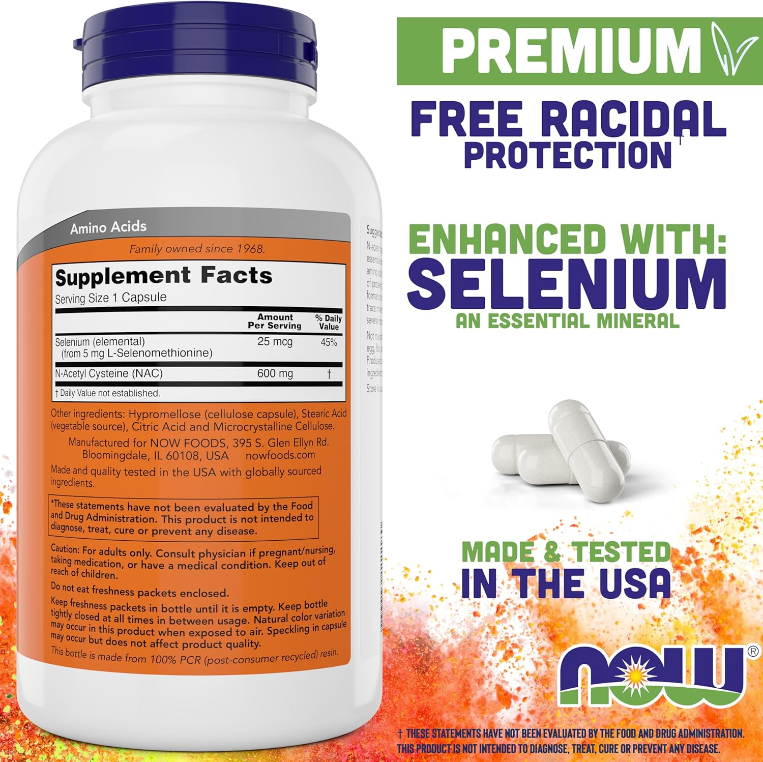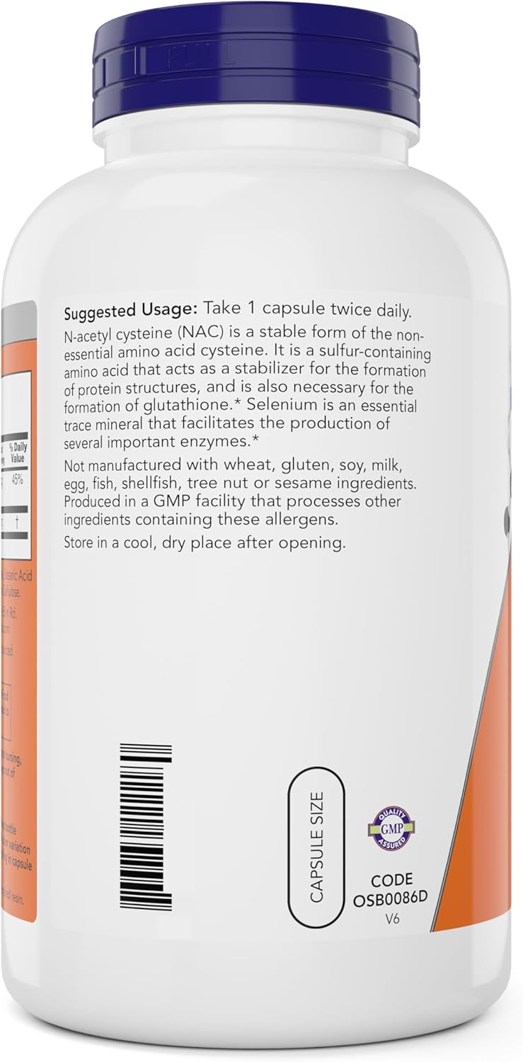 NOW NAC 600mg, 400 Vegetarian Capsules, N-Acetyl Cysteine with Selenium Supplement for Women and Men PREMIUM VERSION OF N-acetyl cysteine (NAC) which is a stable form of the non-essential amino acid cysteine. This product also includes selenium which is an essential trace mineral that facilitates the production of several important enzymes. Superior Manufacturing ? GMP Quality Assured SUGGESTED USAGE: Take 1 capsule twice daily. Also available in sizes: 100 or 250 veg capsules NOW FOODS - TRUSTED FOR OVER 50 YEARS ? Founded in 1968 to provide top-quality, affordable vitamins and health foods ? Family Owned ? Based in the heartland of the Midwest ? Manufactured in the USA ? Tested for purity by NOW's team of 150+ quality-control professionals. Over 10,000 lab tests performed each month. Add to your cart today because you deserve the best life. MAKE THE SMART CHOICE ? Non-GMO ? Kosher Not manufactured with wheat, gluten, soy, milk, egg, fish, shellfish, tree nut or sesame ingredients. Produced in a GMP facility that processes other ingredients containing these allergens