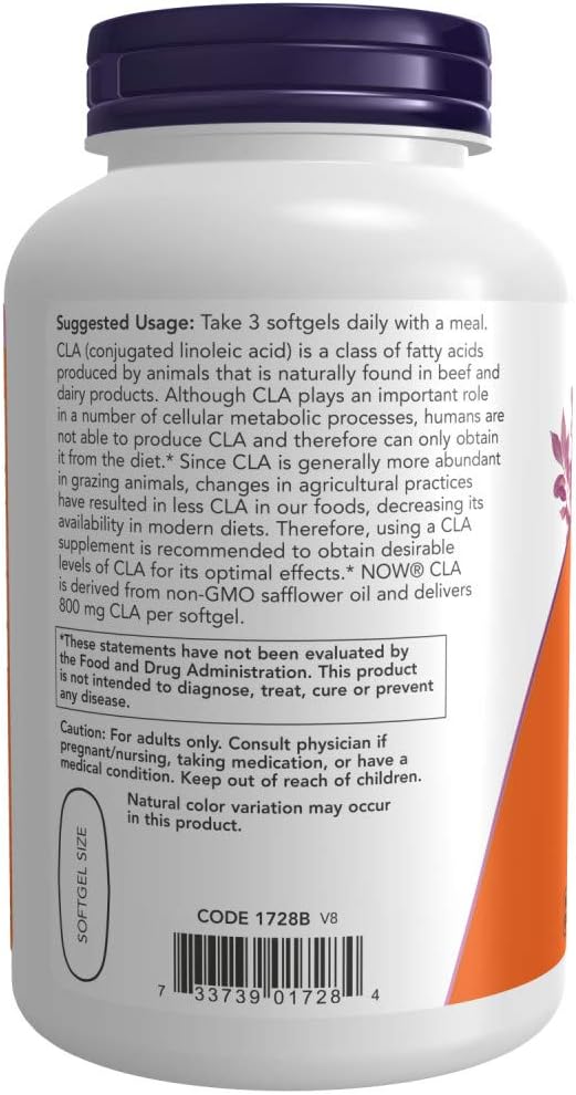 NUTRITIONAL OIL: CLA (Conjugated Linoleic Acid) is a class of fatty acids produced by animals that is naturally found in beef and dairy products. Although CLA plays an important role in a number of cellular metabolic processes, humans are not able to produce CLA and therefore can only obtain it from the diet10FROM NON-GMO SAFFLOWER OIL: NOW CLA is derived from Non-GMO Safflower Oil and delivers 800 mg CLA per softgel10CERTIFICATIONS/CLASSIFICATIONS: Non-GMO, Dairy Free, Egg Free, Made without Gluten, Corn Free, Soy Free, Kosher Contains Gelatin10GMP Quality Assured: NPA A-rated GMP certification means that every aspect of the NOW manufacturing process has been examined, including our laboratory/testing methods (for stability, potency, and product formulation)10Packaged in the USA by a family owned and operated company since 19681010