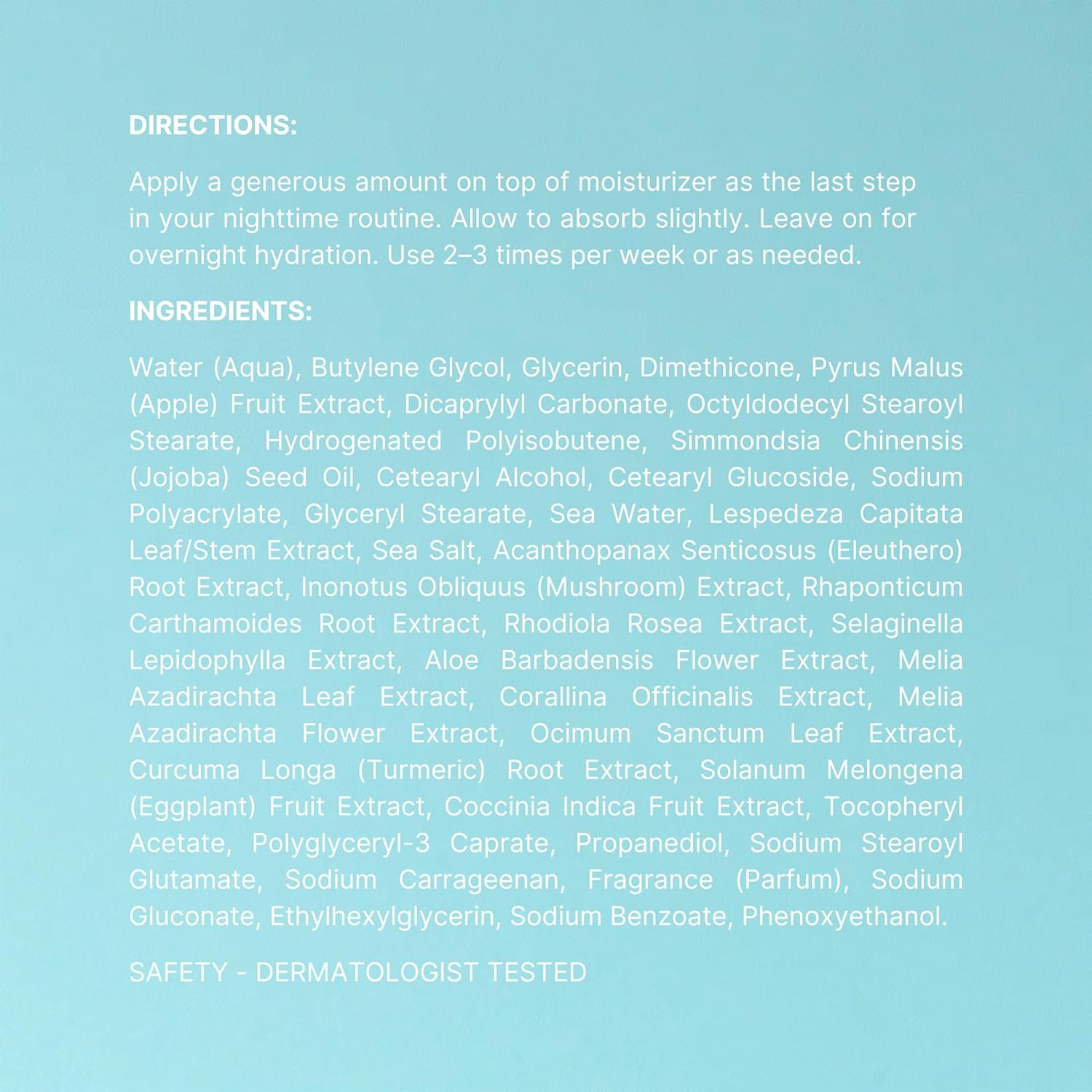 Pillow Glow Overnight Hydration Mask is a skincare marvel that delivers immediate and long-lasting hydration. The transformative gel-cream mask is a beacon of hydration. It helps to drench your skin in an intense rush of moisture. The mask is enriched with a powerful Bioadaptive Botanical Complex, including Rhodiola, Maral Root, Siberian Ginseng, Chaga Mushroom, and the Resurrection Plant. The ingredients fortify your skin against environmental inconvenience. The clean formula ensures worry-free indulgence and defends your skin from the damaging effects of pollution, and free radicals. It helps to address dull, uneven, and tired skin, especially from blue light exposure. Apply generously before bed for immediate and continuous hydration, waking up to skin that's 150% more hydrated, radiant, and refreshed. It provides an increased glow, reduces signs of fatigue, and refines pores. Embrace the rejuvenating power of our key ingredients, including Roundhead Bush Clover, Deep Sea Water, Red Algae, and Apple Extract, ensuring a luminous and supple complexion. Elevate your skincare routine with Pillow Glow and unveil a brighter, healthier version of your skin every morning. : Hydration sleeping mask Adaptogenic resilience Clean, worry-free formula Pollution defence Blue light skin recovery Instant moisturization Proven overnight glow Fatigue reduction Pore refinement Natural moisture barrier support Overnight rejuvenation Essential mineral replenishment Easy application Flexible usage 2–3 times weekly :The mask is formulated to deliver an intense and enduring surge of moisture. The overnight mask ensures that your skin remains 150% more hydrated by morning. It's transformative overnight treatment works seamlessly to support your skin's natural moisture barrier throughout the night : Our hydrating mask is crafted with premium ingredients for comprehensive skin wellness. It contains Bioadaptive Botanical Complex, Roundhead Bush Clover, Deep Sea Water, Red Algae, and Apple Extract : The mask comes with a clean formula that prioritizes your skin's well-being. This formula ensures that each application is safe and gentle on your skin. Our skincare product delivers a refreshing and wholesome experience for a radiant and healthy complexion : The mask helps to combat the effects of blue light exposure and offer a radiant and revitalized appearance. It helps to maintain a vibrant and healthy complexion and offers a protective barrier against its potential harm
