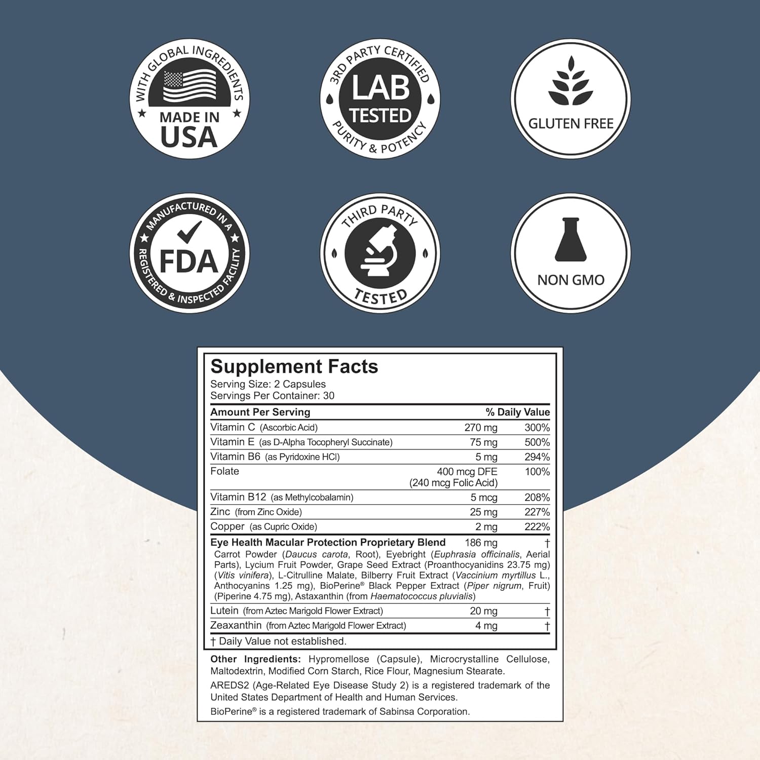 Trusted Quality - NuBest guarantees the highest quality standards for the Eye Health AREDS 2. Made in the USA in an FDA-registered and GMP-certified facility, our product is non-GMO, gluten-free, and dairy-free, ensuring purity, safety, and potency to support your eye function