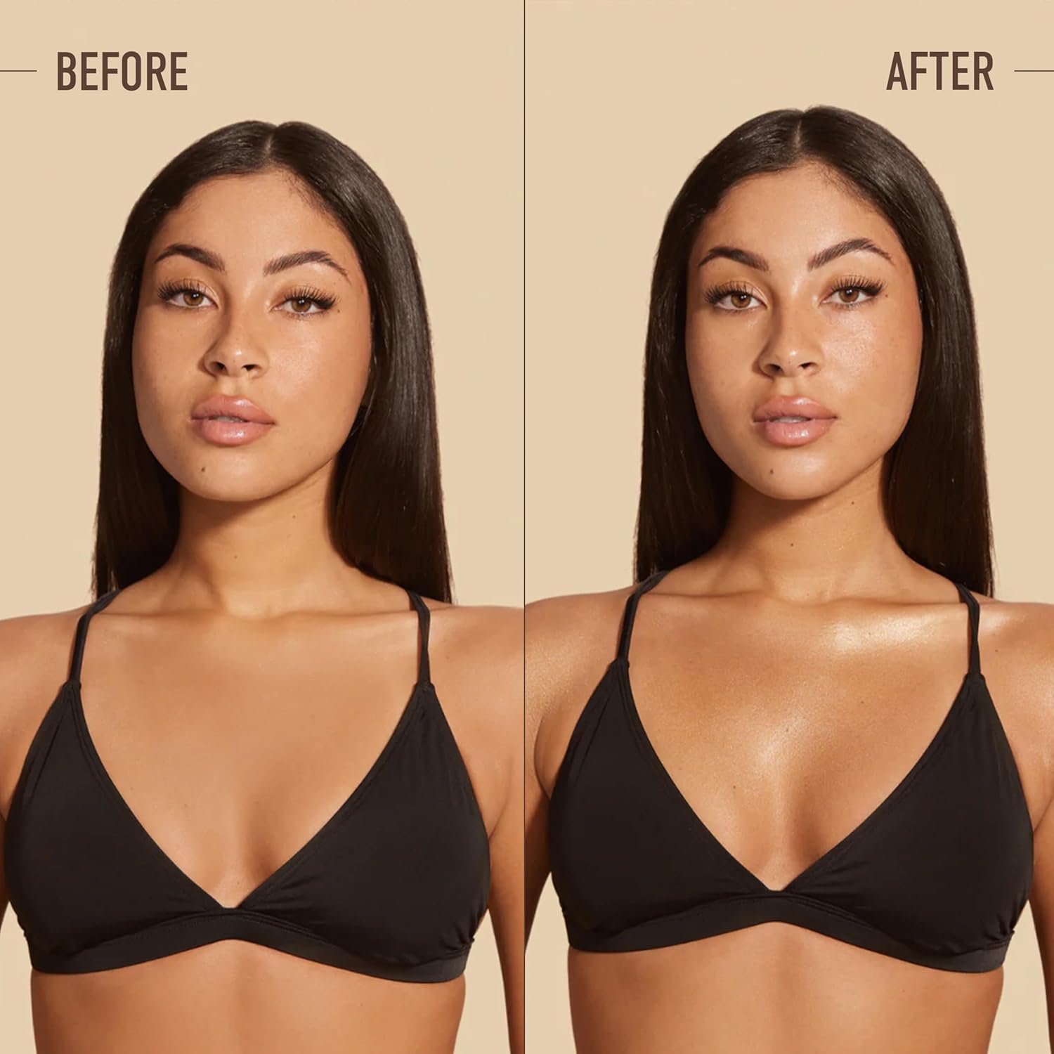About this item INSTANTLY ILLUMINATES SKIN - Accentuate your tan with the silky Body Shimmer by NUDA. This liquid illuminator works instantly to make your body glow, giving a golden and shimmery effect for the ultimate sun-kissed look. SKIN-LOVING NATURAL INGREDIENTS - Made from natural and naturally derived ingredients, our shimmer lotion enhances your natural complexion as it smoothens and brightens your skin. It is enriched with aloe vera, avocado oil, grapeseed oil, and vitamin E and is much like a glow serum that helps keep skin resilient and hydrated. CONSCIENTIOUSLY FORMULATED - Not just 100% natural, vegan, and cruelty-free, it is also gluten-free, paraben-free, sulfate-free, and alcohol-free. This body glitter highlighter checks all the green flags you're looking for in a face and body glitter product. HOW TO USE - A little goes a long way with this golden body shimmer! Shake the bottle well and hydrate and clean the skin before using to ensure even application. Dispense and spread on your collarbones, arms, legs, and shoulders. Avoid contact with sensitive areas and the eyes and make sure to wash your hands after applying. Allow the product 5 minutes to dry before getting dressed. NON-STICKY BODY GLITTER OIL ALTERNATIVE - We purposely formulated this body shimmer gel without mineral oil, so it is not sticky and dries fast. If there is ever transfer on your clothes, the product is easily washable and does not stain clothing permanently. You’ll love to have this highlighter on your skin all the time with its sweet vanilla scent! See more product details,INSTANTLY ILLUMINATES SKIN - Accentuate your tan with the silky Body Shimmer by NUDA. This liquid illuminator works instantly to make your body glow, giving a golden and shimmery effect for the ultimate sun-kissed look,SKIN-LOVING NATURAL INGREDIENTS - Made from natural and naturally derived ingredients, our shimmer lotion enhances your natural complexion as it smoothens and brightens your skin. It is enriched with aloe vera, avocado oil, grapeseed oil, and vitamin E and is much like a glow serum that helps keep skin resilient and hydrated,CONSCIENTIOUSLY FORMULATED - Not just 100% natural, vegan, and cruelty-free, it is also gluten-free, paraben-free, sulfate-free, and alcohol-free. This body glitter highlighter checks all the green flags you're looking for in a face and body glitter product,HOW TO USE - A little goes a long way with this golden body shimmer! Shake the bottle well and hydrate and clean the skin before using to ensure even application. Dispense and spread on your collarbones, arms, legs, and shoulders. Avoid contact with sensitive areas and the eyes and make sure to wash your hands after applying. Allow the product 5 minutes to dry before getting dressed,NON-STICKY BODY GLITTER OIL ALTERNATIVE - We purposely formulated this body shimmer gel without mineral oil, so it is not sticky and dries fast. If there is ever transfer on your clothes, the product is easily washable and does not stain clothing permanently. You’ll love to have this highlighter on your skin all the time with its sweet vanilla scent!