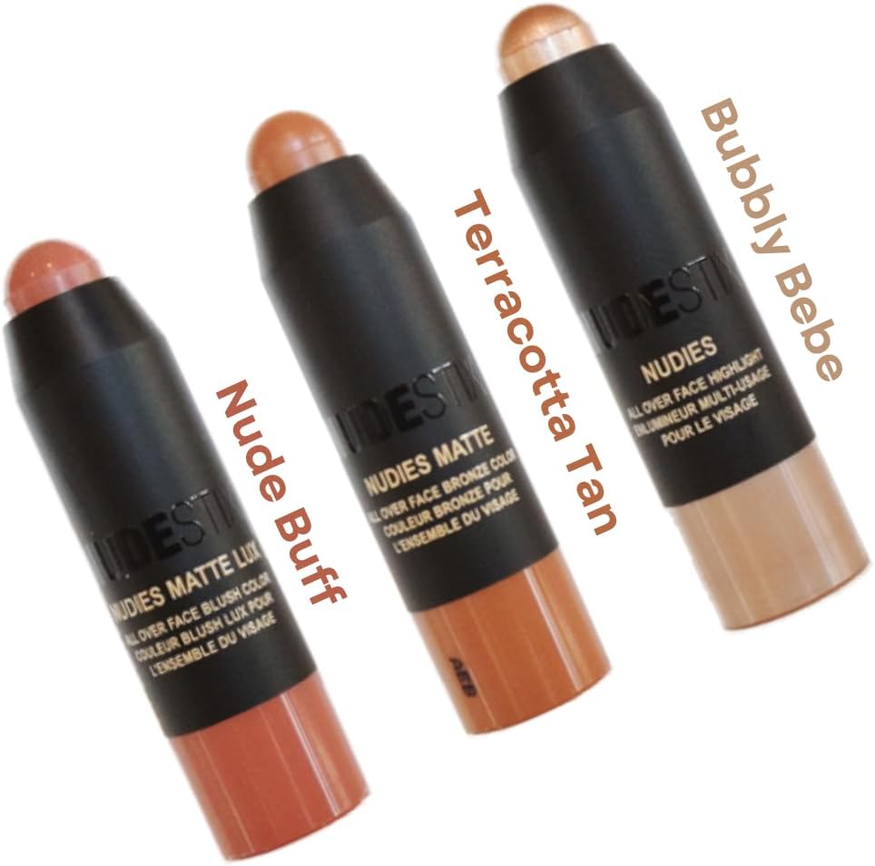 VERSATILE MAKEUP LOOK: Create soft and sculpted makeup looks for cheeks, eyes, and lips with the included Nudies Matte Lux All Over Face Blush, Matte All Over Face Bronze, and Glow All Over Face Highlight colors
