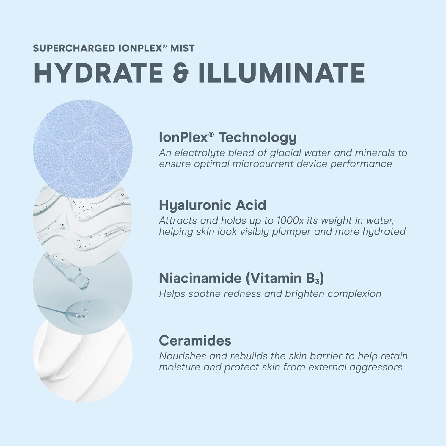 About this item Supercharged Hydration - This 3-in-1 facial mist deeply hydrates skin to enhance your microcurrent treatment and refresh skin throughout the day. Formulated to lock in moisture, and reduce the look of fine lines, and pores for a lasting radiant appearance. NuFACE IonPlex® Technology - NuFACE microcurrent facials utilize low-level electrical currents to mimic your body's natural ionic flow to sculpt and tone skin and facial muscles. Proprietary IonPlex® Blend delivers a precise concentration of ions and glacial water to help prep skin for your microcurrent treatment. Supercharged Ingredients - Our multitasking face mist is formulated with hyaluronic acid to attract and hold up to 1000x its weight in water to help skin look visibly more hydrated, niacinamide to soothe and brighten, and ceramides to nourish and rebuild your skin's moisture barrier. Prep the Skin - Use the Supercharged IonPlex® Mist Spray before treatment to enhance results, during treatments to rehydrate activator, or throughout the day for a refreshing moisture boost. Clean + Effective Formula - NuFACE Microcurrent Skincare is aesthetician-created and formulated with clean, nontoxic ingredients and free of parabens, phthalates, mineral oil, and added fragrance. See more product details,Supercharged Hydration - This 3-in-1 facial mist deeply hydrates skin to enhance your microcurrent treatment and refresh skin throughout the day. Formulated to lock in moisture, and reduce the look of fine lines, and pores for a lasting radiant appearance,NuFACE IonPlex® Technology - NuFACE microcurrent facials utilize low-level electrical currents to mimic your body's natural ionic flow to sculpt and tone skin and facial muscles. Proprietary IonPlex® Blend delivers a precise concentration of ions and glacial water to help prep skin for your microcurrent treatment,Supercharged Ingredients - Our multitasking face mist is formulated with hyaluronic acid to attract and hold up to 1000x its weight in water to help skin look visibly more hydrated, niacinamide to soothe and brighten, and ceramides to nourish and rebuild your skin's moisture barrier,Prep the Skin - Use the Supercharged IonPlex® Mist Spray before treatment to enhance results, during treatments to rehydrate activator, or throughout the day for a refreshing moisture boost,Clean + Effective Formula - NuFACE Microcurrent Skincare is aesthetician-created and formulated with clean, nontoxic ingredients and free of parabens, phthalates, mineral oil, and added fragrance