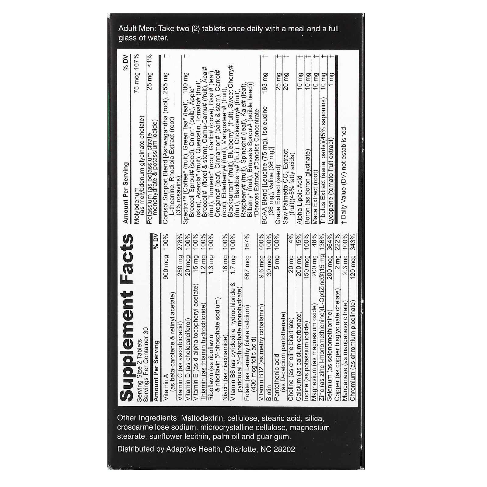 Only for adult males over 18 years. Use only as directed. Consult your healthcare practitioner if you have or suspect a medical condition, including any hormone sensitive conditions or if you use any medications. Avoid taking any other multivitamin unless instructed by a doctor, especially if it contains Vitamin A. Side effects may include upset stomach or headache, particularly if taken without adequate food. Discontinue use two weeks prior to surgery or if any serious adverse reaction occurs. Do not use product if safety seal is missing. Made without aspirin or iron.