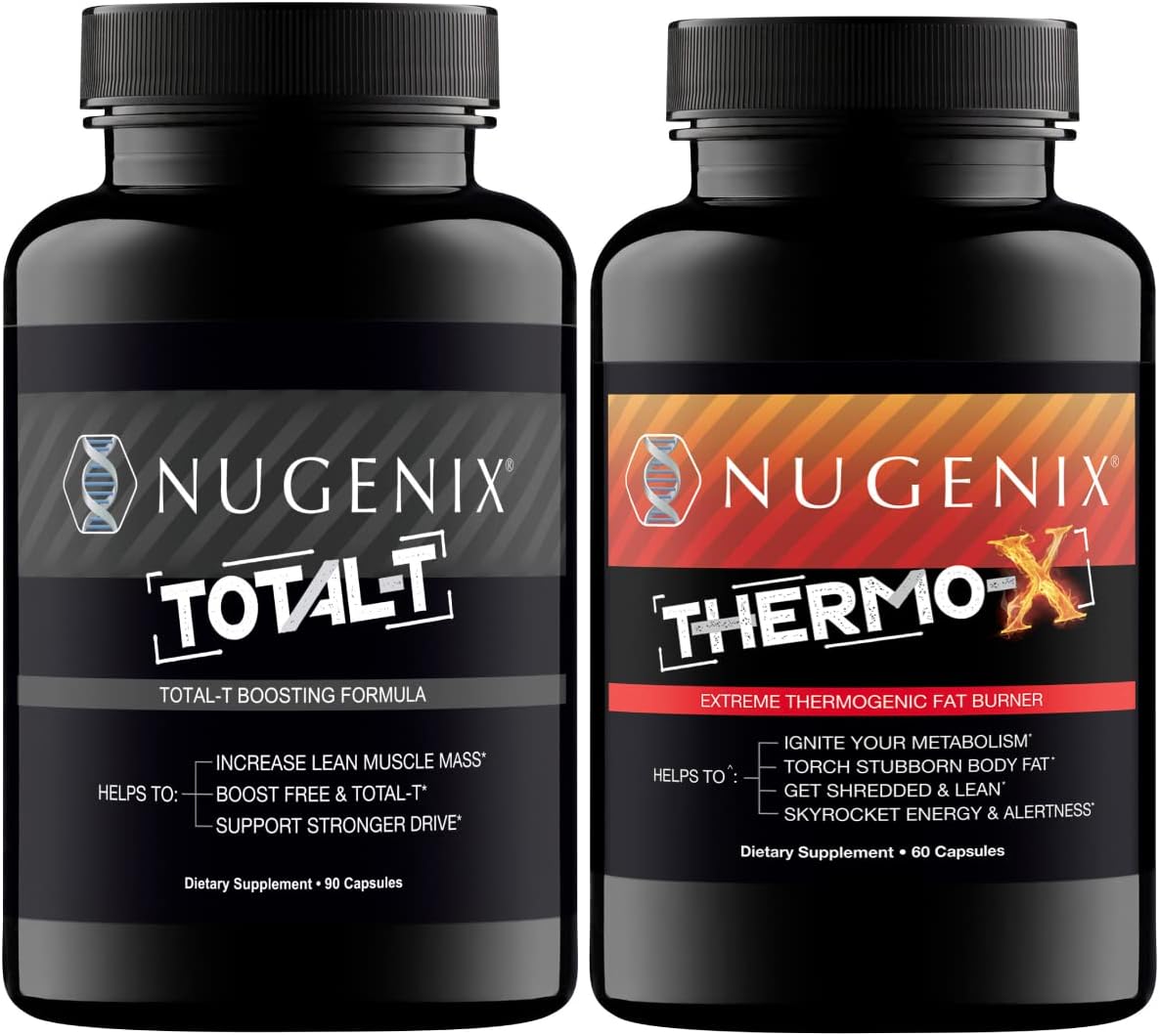 Total-T: Scientifically formulated, our new-and-improved compound helps increase lean muscle mass, and boost free & total testosterone levelsTotal-T: Ingredients in Nugenix Total-T have been clinically shown to deliver more powerful, comprehensive testosterone support where others fall short, without using any stimulants or unnecessary fillersThermo-X: Nugenix Thermo-X is our most elite fat incinerator ever. Packed with even more key, scienced-backed ingredients, including clinical-strength Chromax, RoseFit, Capsimax and caffeine, for harder-hitting resultsThermo-X: Get shredded and lean with Nugenix Thermo-X, designed to attack weight loss from all angles. Boost a waning metabolism, skyrocket energy and alertness, and lose stubborn body fatMade in the USA according to current FDA Good Manufacturing Practices and using premium ingredients carefully sourced from the U.S. and around the globeNugenix Total-T - Free and Total Testosterone Booster for Men, 90 Count and Nugenix Thermo-X: Thermogenic Fat Burner Supplement for Men, Extreme Metabolic Accelerator, 60 Count