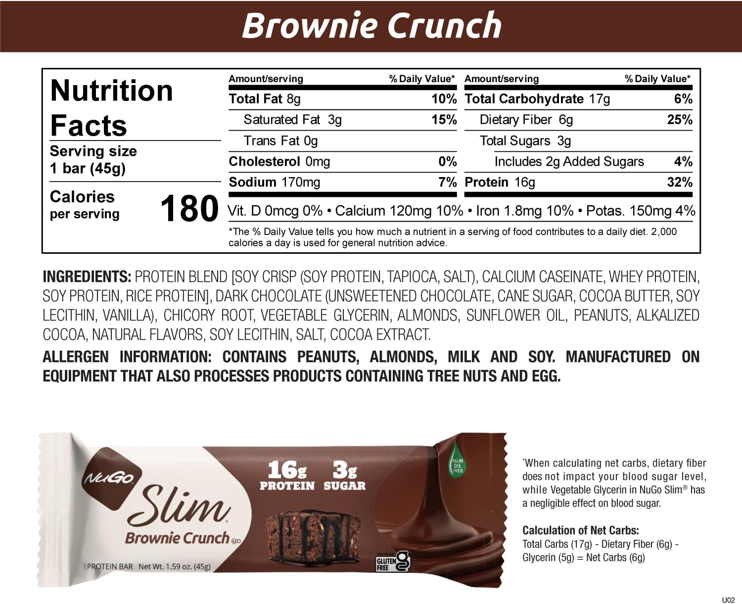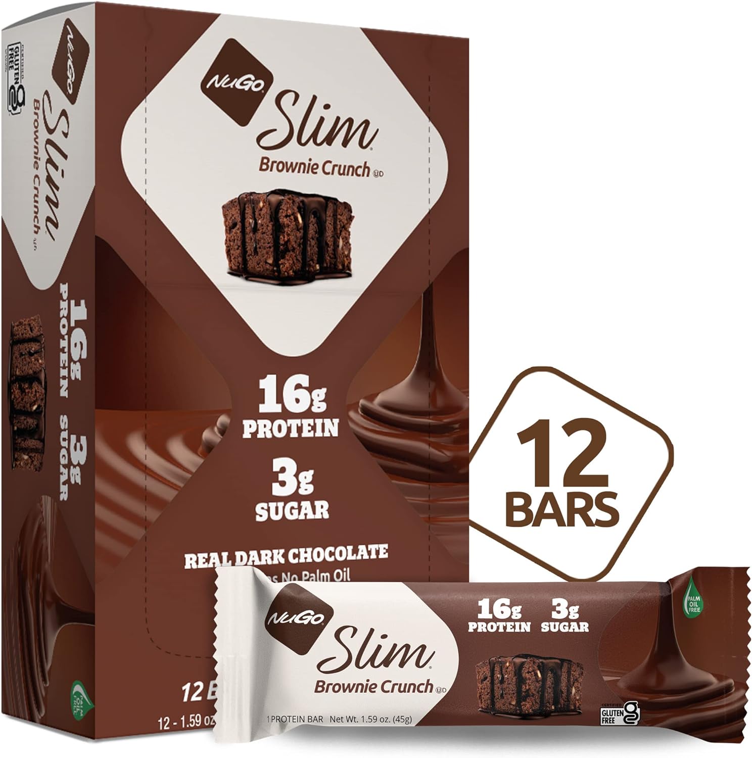 DESCRIPTION : NuGo Slim Dark Chocolate Brownie Crunch, 16g Protein, 3g Sugar, 7g Fiber, 180 Calories, Low Net Carbs, Gluten Free, 12 Count
