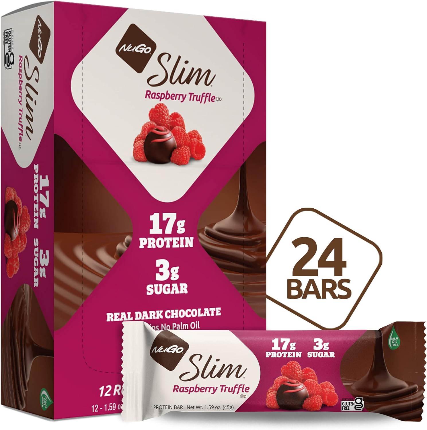 DESCRIPTION : NuGo Slim Dark Chocolate Raspberry Truffle, 17g Protein, 2g Sugar, 7g Fiber, 160 Calories, Low Net Carbs, Gluten Free, 12 Count