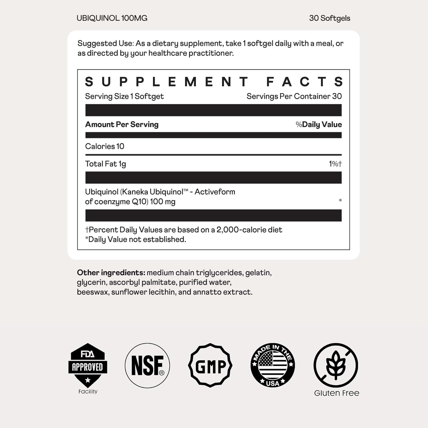 About this item Ubiquinol CoQ10: This product contains ubiquinol 100 mg, an active and highly bioavailable form of coenzyme Q10. Ubiquinol is essential for cellular energy production and overall wellness. Cardiovascular Support: This supplement provides cardiovascular support. The active form of CoQ10, ubiquinol, aids in maintaining a healthy heart and promoting optimal cardiovascular function. Dental Health: Our ubiquinol CoQ10 soft gels are beneficial for dental health. By promoting gum health and helping to prevent oral issues, this supplement supports a healthy smile. Gluten-Free: These 30 softgels are gluten-free, making them a suitable choice for individuals with dietary restrictions. Each bottle provides a 1 months supply of our ubiquinol CoQ10. Immune Support: The active form of coenzyme Q10 in our product not only supports liver health but also strengthens the immune system, helping to protect the body against harmful pathogens. › See more product details,Ubiquinol CoQ10: This product contains ubiquinol 100 mg, an active and highly bioavailable form of coenzyme Q10. Ubiquinol is essential for cellular energy production and overall wellness,Cardiovascular Support: This supplement provides cardiovascular support. The active form of CoQ10, ubiquinol, aids in maintaining a healthy heart and promoting optimal cardiovascular function,Dental Health: Our ubiquinol CoQ10 soft gels are beneficial for dental health. By promoting gum health and helping to prevent oral issues, this supplement supports a healthy smile,Gluten-Free: These 30 softgels are gluten-free, making them a suitable choice for individuals with dietary restrictions. Each bottle provides a 1 months supply of our ubiquinol CoQ10,Immune Support: The active form of coenzyme Q10 in our product not only supports liver health but also strengthens the immune system, helping to protect the body against harmful pathogens