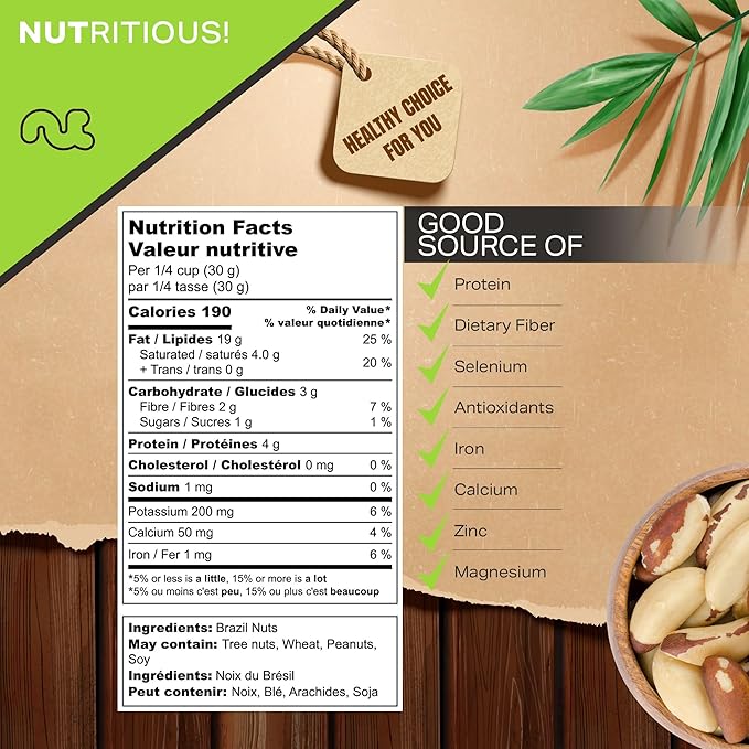 NUT CRAVINGS Nueces de Brasil crudas ofrecen un bocadillo nutritivo y natural en su forma más pura. Estas nueces enteras, sin sal y sin cáscara, vienen en una práctica bolsa resellable de 16 onzas (1 libra) que mantiene la frescura y el sabor intactos. Ricas en selenio, grasas saludables y proteínas vegetales, son ideales para dietas veganas, keto y kosher. Perfectas para consumir solas como snack saludable o para añadir a mezclas de frutos secos, granolas o recetas caseras, estas nueces a granel representan una opción deliciosa y energizante para quienes buscan calidad, pureza y bienestar en su alimentación diaria