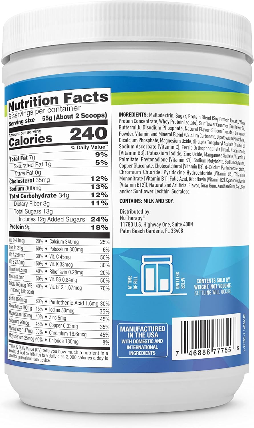 Supports immune, muscle, and bone health240 nutritious calories, 3g of fiber, and 9g of quality protein23 essential vitamins and minerals, including antioxidantsHelps convert the food you eat into cellular energyDelicious Creamy Vanilla flavorNuTherapy nutritional protein powder provides nutrition for active adults, made easy and delicious! Each serving of NuTherapy® nutritional protein powder is an excellent source of 23 essential vitamins and minerals and helps fill nutrient gaps. Plus, this nutritious protein powder helps to support a healthy immune system, bone health, and cellular energy metabolism. Shake up this NuTherapy® nutritional protein powder with cold water or blend into a tasty smoothie to enjoy the rich and creamy Vanilla flavor
