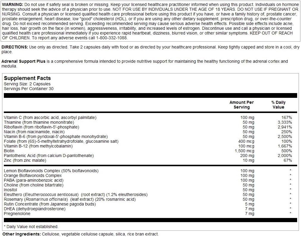 About this item COMPLETE ADRENAL SUPPORT - Adrenal Support Plus is designed to help maintain healthy nerve function, promoting resilience and balance for men and women facing daily challenges HERBAL AND HORMONAL BLEND - Featuring the essential hormone precursor pregnenolone and adaptogenic herbs, our adrenal complex helps promote cellular energy, healthy red blood cells, and more NUTRIENT-RICH FORMULA - Our adrenal support supplement combines essential B vitamins, zinc, and minerals to help support energy metabolism, nerve function, and overall well-being, making it a key daily health manager DHEA FOR ADRENAL HEALTH - Formulated with DHEA, a hormone produced by the adrenal gland that can become low during times of stress, helping support balance and vitality TRUSTED SUPPLEMENTS - Nutra BioGenesis has been dedicated to creating premium supplements since 2000. Crafted with care and backed by science, we're here to support your journey to better health โบ See more product details,COMPLETE ADRENAL SUPPORT - Adrenal Support Plus is designed to help maintain healthy nerve function, promoting resilience and balance for men and women facing daily challenges,HERBAL AND HORMONAL BLEND - Featuring the essential hormone precursor pregnenolone and adaptogenic herbs, our adrenal complex helps promote cellular energy, healthy red blood cells, and more,NUTRIENT-RICH FORMULA - Our adrenal support supplement combines essential B vitamins, zinc, and minerals to help support energy metabolism, nerve function, and overall well-being, making it a key daily health manager,DHEA FOR ADRENAL HEALTH - Formulated with DHEA, a hormone produced by the adrenal gland that can become low during times of stress, helping support balance and vitality,TRUSTED SUPPLEMENTS - Nutra BioGenesis has been dedicated to creating premium supplements since 2000. Crafted with care and backed by science, we're here to support your journey to better health