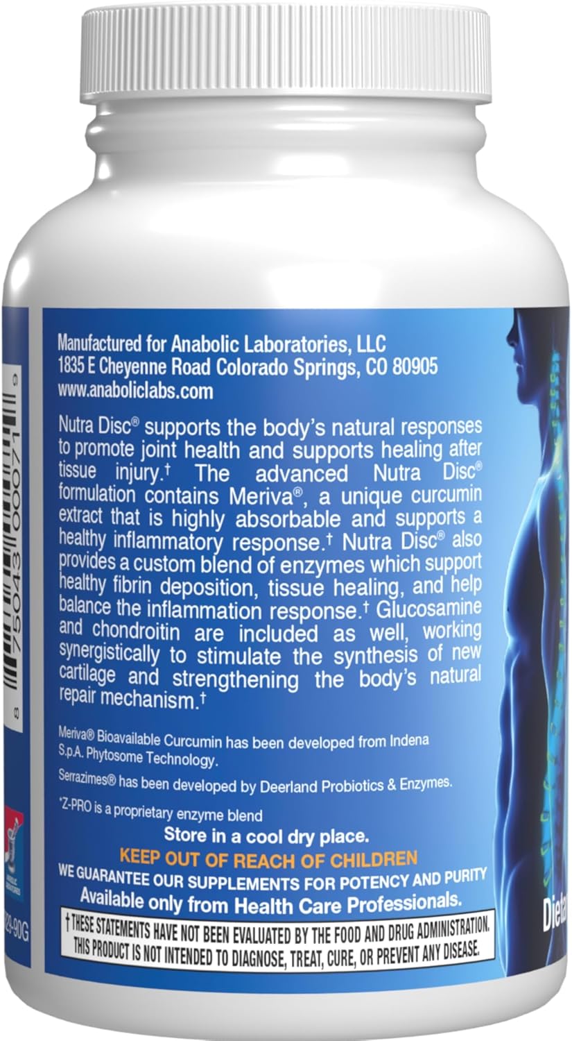 About this item Professional Formula: We are proud to offer our one of a kind soft tissue and joint supplements for men and women featuring the reparative Z-Pro Enzyme blend with proprietary proteolytic Serrazimes Elevate your Comfort: Feel the Nutra Disc difference with our joint tendon and ligament supplements based on clinical studies showing the positive effects of protease enzymes for speeding up recovery Anabolic Advantage: Unlike generic ligament and tendon supplements for men & women our caps were specifically made for practitioners so you can rest assured you're getting professional grade products Trusted Name Since 1924: Anabolic Laboratories has been committed to providing the highest quality nutritional products for 100 years and counting including our glucosamine chondroitin capsules Guaranteed Potent and Pure: You can rest assured knowing you have a premium product with Anabolic Labs as all of our supplements are cGMP made in our NPA and FDA inspected American labs See more product details,Professional Formula: We are proud to offer our one of a kind soft tissue and joint supplements for men and women featuring the reparative Z-Pro Enzyme blend with proprietary proteolytic Serrazimes,Elevate your Comfort: Feel the Nutra Disc difference with our joint tendon and ligament supplements based on clinical studies showing the positive effects of protease enzymes for speeding up recovery,Anabolic Advantage: Unlike generic ligament and tendon supplements for men & women our caps were specifically made for practitioners so you can rest assured you're getting professional grade products,Trusted Name Since 1924: Anabolic Laboratories has been committed to providing the highest quality nutritional products for 100 years and counting including our glucosamine chondroitin capsules,Guaranteed Potent and Pure: You can rest assured knowing you have a premium product with Anabolic Labs as all of our supplements are cGMP made in our NPA and FDA inspected American labs
