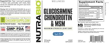 About this item POWERFUL JOINT SUPPORT – NutraBio’s Glucosamine Chondroitin MSM works to promote joint health by using a powerful combination of ingredients. Glucosamine is a major component of connective tissue, Chondroitin is can moisturize the joints, and MSM promotes maintenance of the joints. HYDRATE CONNECTIVE TISSUE – Chondroitin can protect cartilage by drawing water and nutrients into the cartilage and connective tissue. Chondroitin is partially responsible for strength, flexibility, and shock absorption in joints. SUPERIOR QUALITY - NutraBio uses only the best, and this product is no exception. This product is gluten free, soy free, third-party tested, non-GMO, and made in the USA. Our manual encapsulation process ensures our products are free of fillers and stearates. THIRD PARTY TESTED, FULL DISCLOSURE – Like all NutraBio products, this product is tested by an independent third party lab to ensure it is both pure and that it meets our strict quality standards. All NutraBio products feature fully transparent labels with no proprietary blends. Ideal for Joint Care: Perfect for athletes, those with age-related joint concerns, or anyone looking to maintain healthy joint function. See more product details,POWERFUL JOINT SUPPORT – NutraBio’s Glucosamine Chondroitin MSM works to promote joint health by using a powerful combination of ingredients. Glucosamine is a major component of connective tissue, Chondroitin is can moisturize the joints, and MSM promotes maintenance of the joints,HYDRATE CONNECTIVE TISSUE – Chondroitin can protect cartilage by drawing water and nutrients into the cartilage and connective tissue. Chondroitin is partially responsible for strength, flexibility, and shock absorption in joints,SUPERIOR QUALITY - NutraBio uses only the best, and this product is no exception. This product is gluten free, soy free, third-party tested, non-GMO, and made in the USA. Our manual encapsulation process ensures our products are free of fillers and stearates,THIRD PARTY TESTED, FULL DISCLOSURE – Like all NutraBio products, this product is tested by an independent third party lab to ensure it is both pure and that it meets our strict quality standards. All NutraBio products feature fully transparent labels with no proprietary blends,Ideal for Joint Care: Perfect for athletes, those with age-related joint concerns, or anyone looking to maintain healthy joint function