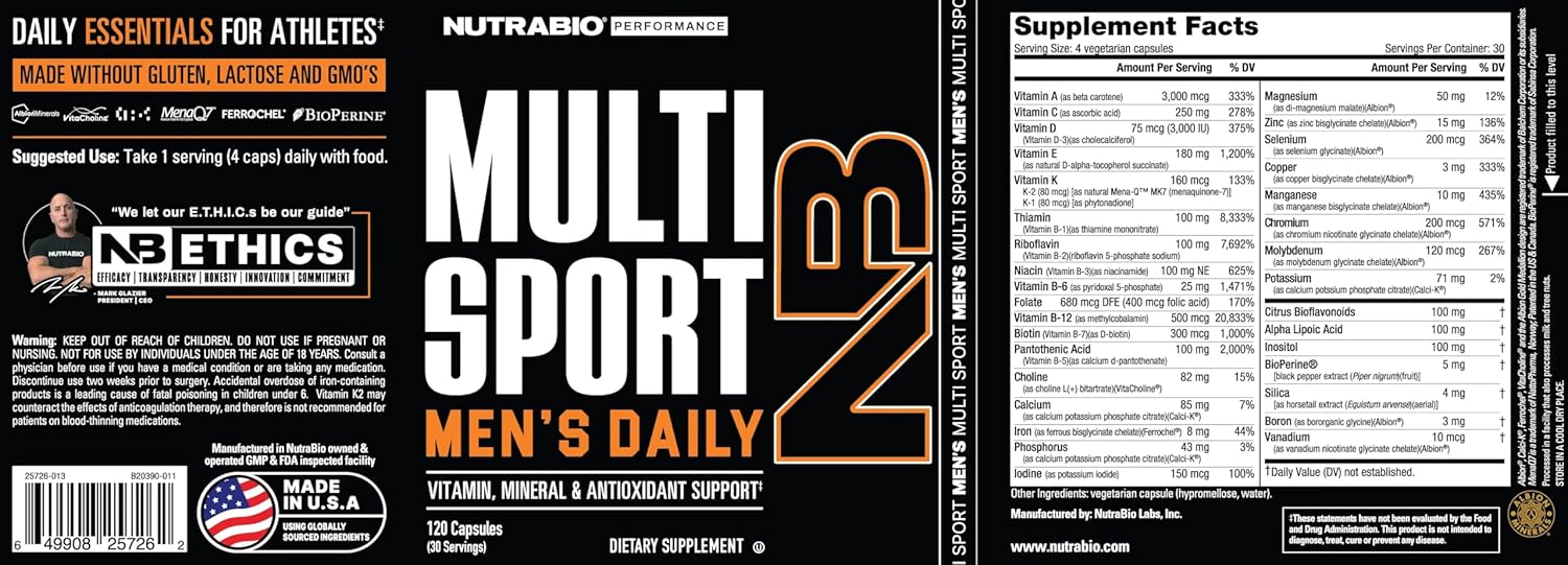 About this item SPORTS PERFORMANCE β NutraBio MultiSport provides the optimum blend of vitamins, minerals, antioxidants, and micronutrients to support athletes of all types. MultiSport is also beneficial for immune system health and can supplement weight loss regimens with necessary nutrients. B-COMPLEX β Our multivitamin includes a complete B-Complex including Vitamin B1, B2, B3, B5, B6, Methyl B12, Folic Acid, Biotin, Choline Bitartrate, and Inositol. B Vitamins are helpful in boosting energy and metabolism. HIGH QUALITY NUTRITION β MultiSport provides a wide array of high quality basic nutrients, using Albion vitamins and minerals, including molybdenum, magnesium, zinc, selenium, calcium, and more. These high quality nutrients absorb faster and are gentle on the stomach. HAIR, SKIN, AND NAILS β MultiSport contains biotin, silica, iron, and folic acid, all of which are beneficial for the health of your hair, skin, and nails. WITHOUT COMPROMISE - NutraBio uses only the best, and this product is no exception. MultiSport is non-GMO, gluten free, soy free, third-party tested, certified kosher, and made in the USA. MultiSport contains no proprietary blends or hidden ingredients, and our encapsulation process uses no excipients. See more product details,SPORTS PERFORMANCE β NutraBio MultiSport provides the optimum blend of vitamins, minerals, antioxidants, and micronutrients to support athletes of all types. MultiSport is also beneficial for immune system health and can supplement weight loss regimens with necessary nutrients,B-COMPLEX β Our multivitamin includes a complete B-Complex including Vitamin B1, B2, B3, B5, B6, Methyl B12, Folic Acid, Biotin, Choline Bitartrate, and Inositol. B Vitamins are helpful in boosting energy and metabolism,HIGH QUALITY NUTRITION β MultiSport provides a wide array of high quality basic nutrients, using Albion vitamins and minerals, including molybdenum, magnesium, zinc, selenium, calcium, and more. These high quality nutrients absorb faster and are gentle on the stomach,HAIR, SKIN, AND NAILS β MultiSport contains biotin, silica, iron, and folic acid, all of which are beneficial for the health of your hair, skin, and nails,WITHOUT COMPROMISE - NutraBio uses only the best, and this product is no exception. MultiSport is non-GMO, gluten free, soy free, third-party tested, certified kosher, and made in the USA. MultiSport contains no proprietary blends or hidden ingredients, and our encapsulation process uses no excipients