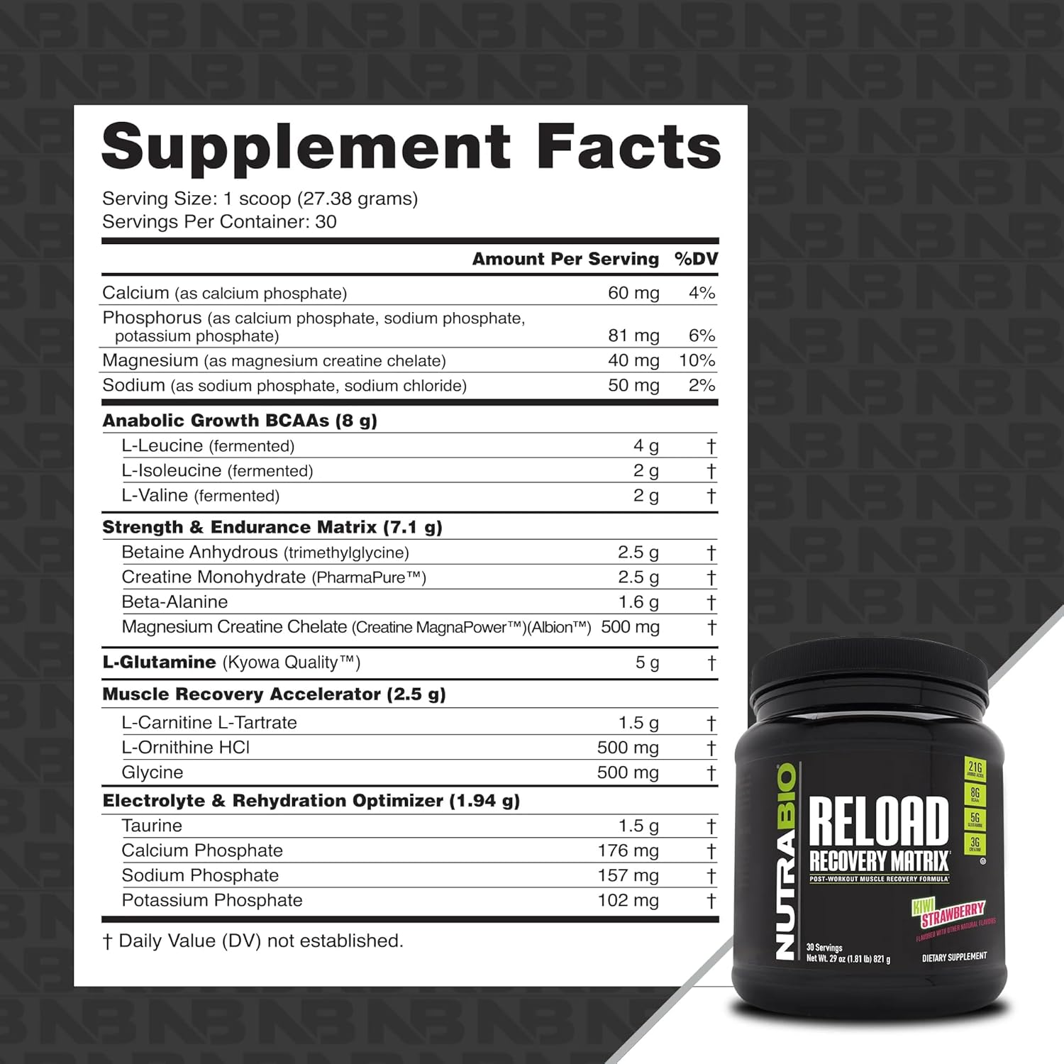 Nutrabio Reload - Powerful Muscular Recovery Formula - Post-Workout Supplement - 3G Creatine - 8G Bcaas - 5G Glutamine - 30 Servings, Kiwi Strawberry