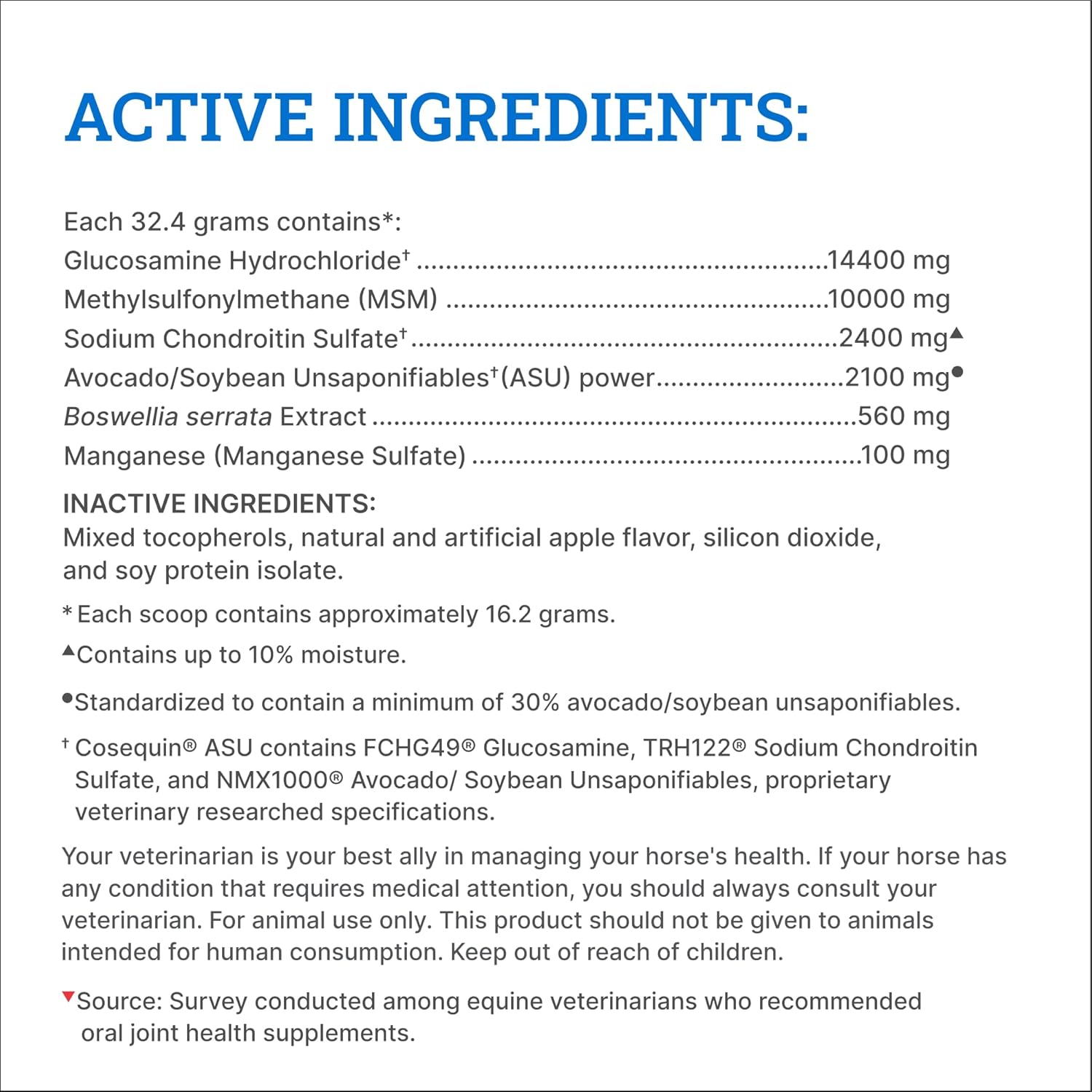 Joint Health Support For Horses: Cosequin Is The #1 Veterinarian Recommended Joint Health Supplement Brand*. This Supplement Is Formulated With Glucosamine, Chondroitin Sulfate, Methylsulfonylmethane (Msm), And Avocado/Soybean Unsaponifiables (Asu) To Support Joint Health