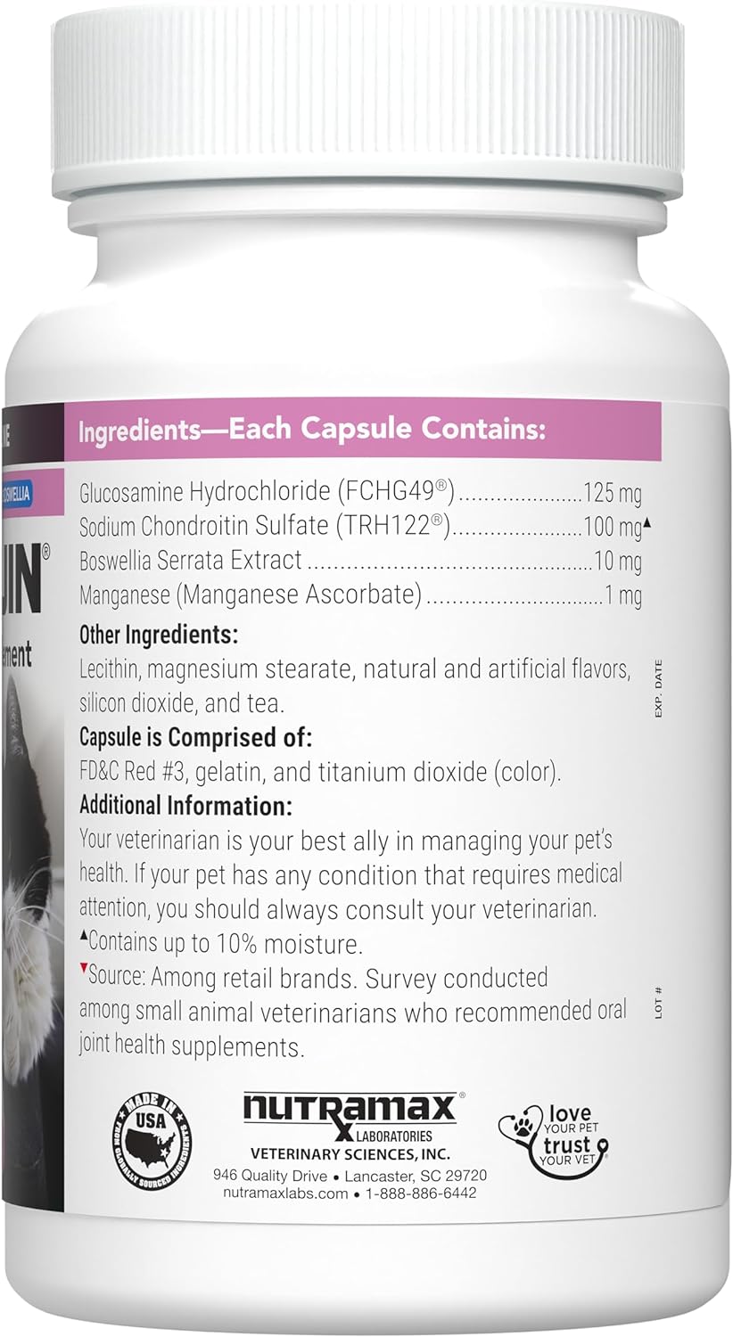 Cosequin Maximum Strength For Cats Contains Glucosamine Hydrochloride, Sodium Chondroitin Sulfate And Boswellia. This Combination Of Ingredients Help Support Healthy Cartilage. Cosequin Joint Health Supplements Are Brought To You By Nutramax Laboratories Veterinary Sciences, The #1 Veterinarian Recommended Supplement Company. Source: Among Retail Brands. Survey Conducted Among Small Animal Veterinarians Who Recommended Oral Joint Health Supplements. *Source: Survey Conducted Among Small Animal Veterinarians Who Recommended Animal Supplements