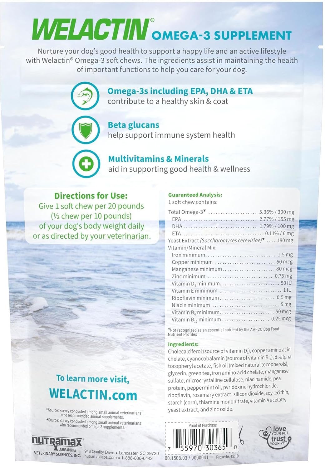Welactin Daily Omega-3 Supplement Helps Maintain Skin And Coat, Immune And Overall Health. Welactin Omega-3 Supplements Are Brought To You By Nutramax Laboratories Veterinary Sciences, The #1 Veterinarian Recommended Supplement Company. Source: Survey Conducted Among Small Animal Veterinarians Who Recommended Omega-3 Supplements. *Source: Survey Conducted Among Small Animal Veterinarians Who Recommended Animal Supplements