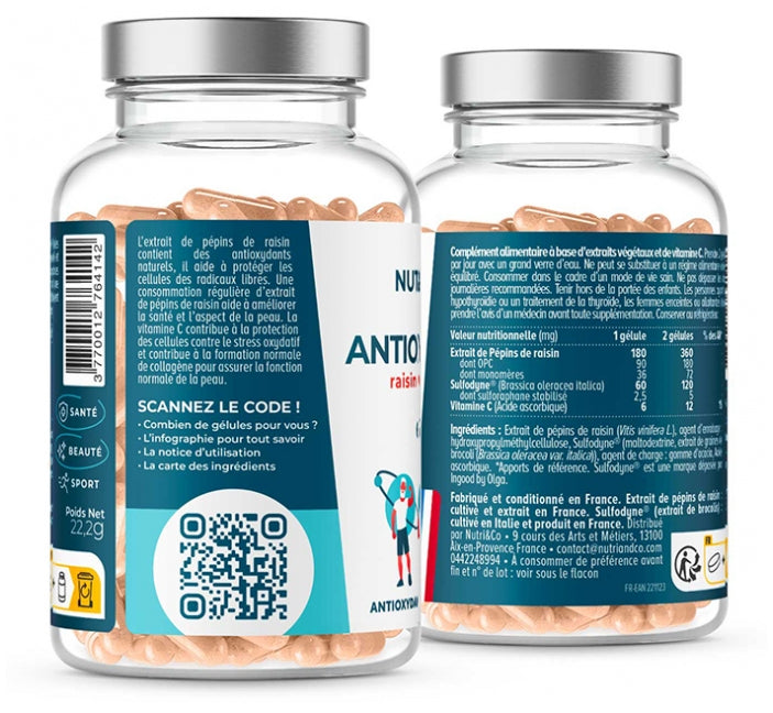 Nutri&Co Antioxidant 60 Capsules Is A Dietary Supplement Based On Plant Extracts And Vitamin C That Acts On Cells And Collagen Formation. Grape Seed Extract Is Rich In Natural Antioxidants, Helping To Protect Cells From The Damaging Effects Of Free Radicals. Regular Consumption Of This Extract Helps Improve Skin Health And Radiance, Giving It A Revitalized, Radiant Appearance. Vitamin C Protects Cells Against Oxidative Stress And Supports Normal Collagen Formation, Which Is Essential For Maintaining Skin Function And Natural Beauty. Made In France