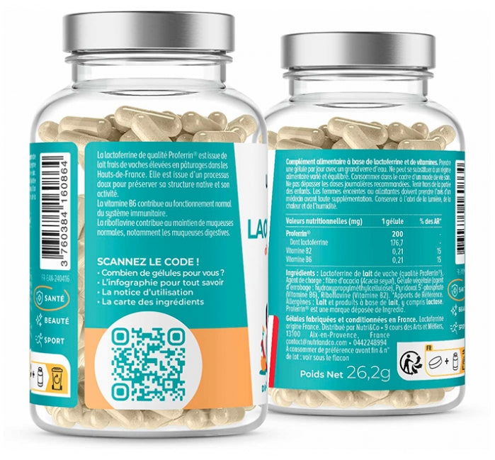Cow'S Milk Lactoferrin (ProferrinĀ® Grade), Bulking Agent: Acacia Fibre (Acacia Seyal), Vegetable Capsule (Coating Agent: Hydroxypropylmethylcellulose), Pyridoxal 5'-Phosphate (Vitamin B6), Riboflavin (Vitamin B2). *Reference Intakes. Allergens: Milk And Milk-Based Products, Including Lactose. ProferrinĀ® Is A Registered Trademark Of Ingredia