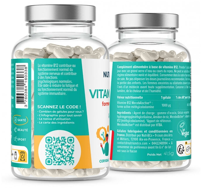 Nutri&Co Vitamin B12 120 Capsules Is A Vitamin B12-Based Dietary Supplement That Acts On The Nervous And Immune Systems. Vitamin B12 Plays An Essential Role In The Proper Functioning Of The Nervous System And Supports Balanced Psychological Functions. It Also Helps Reduce Fatigue While Strengthening The Immune System For Optimal Well-Being. By Contributing To The Formation Of Red Blood Cells And Energy Metabolism, It Supports Vital Functions. It'S A Complete Solution To Vitamin Deficiency. Vegan. Made In France